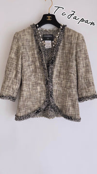 CHANEL 03S Beige Cotton Ruffled Floral Trim Tweed Jacket 36 38 シャネル ベージュ コットン ラッフル フローラルトリム ツイード ジャケット 即発