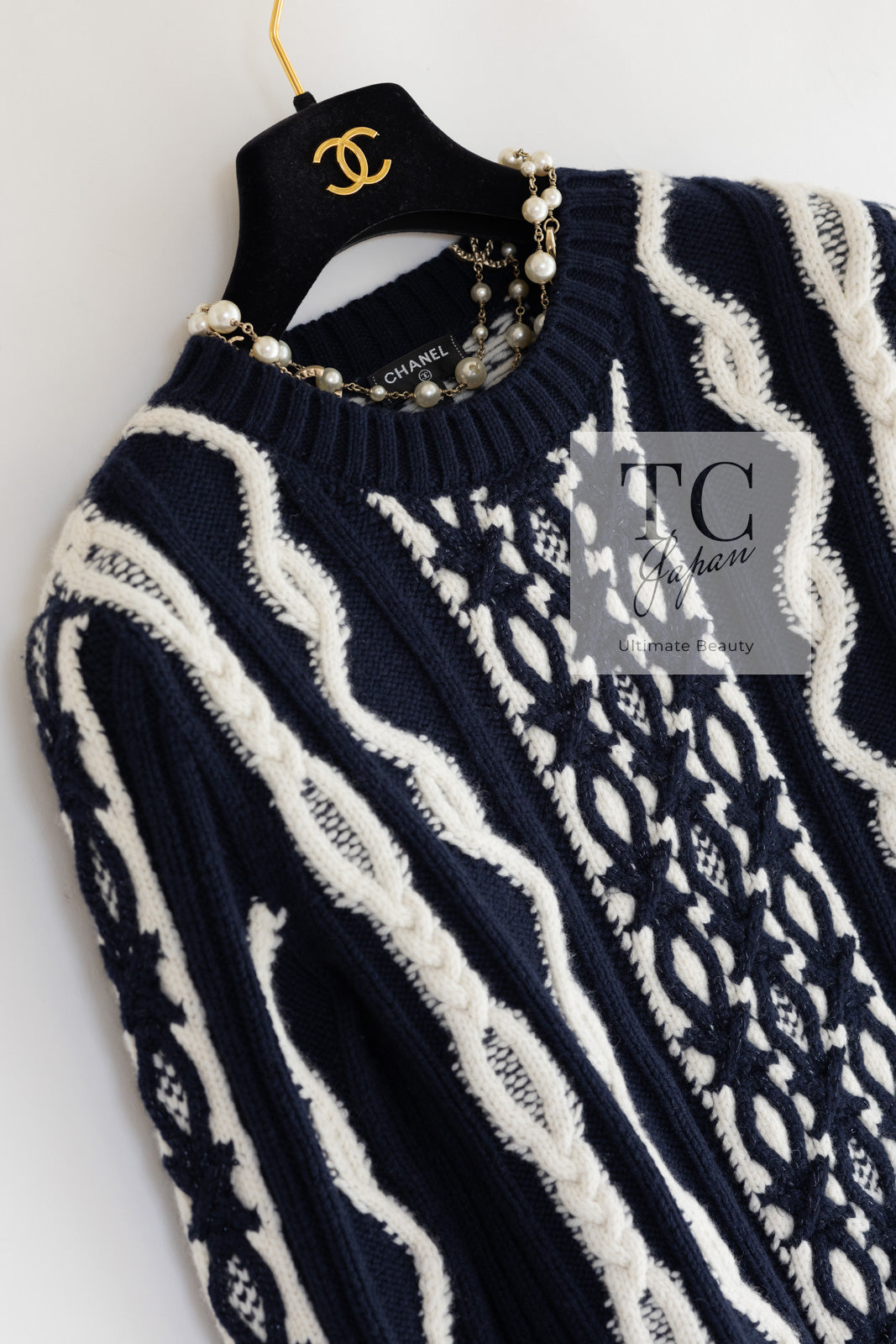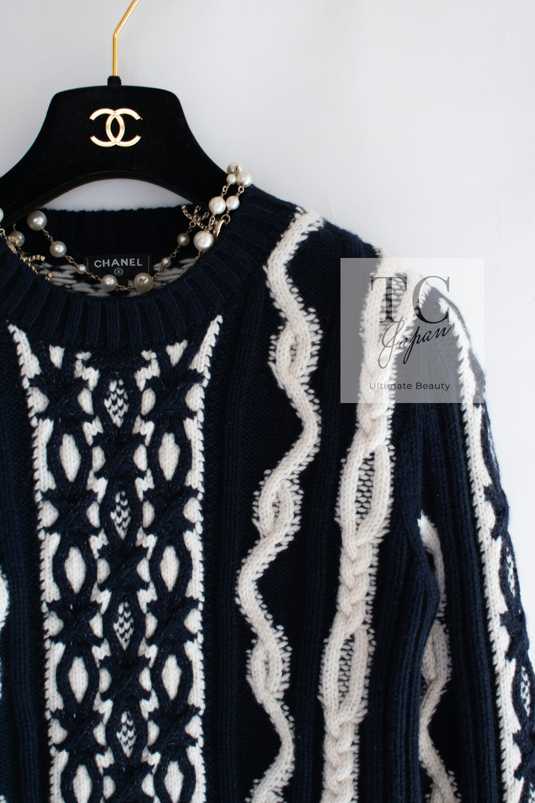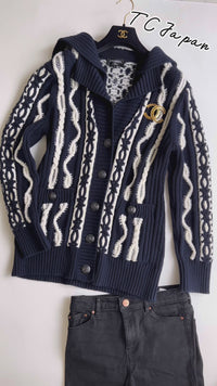 CHANEL 18PF Navy Ivory Wool Cashmere Knit Sweater 34 シャネル ネイビー アイボリー ウール カシミア ケーブル ニット セーター 即発
