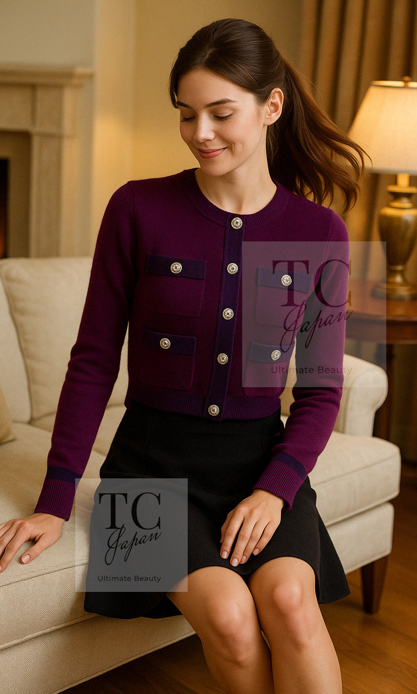 CHANEL 23PA Plum Purple CC Logo Buttons Cropped Cashmere Knit Cardigan 36 シャネル プラム パープル ココ ボタン クロップド カシミヤ ニット カーディガン 即発