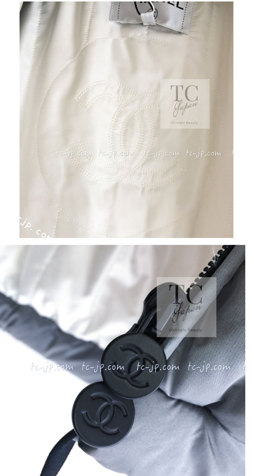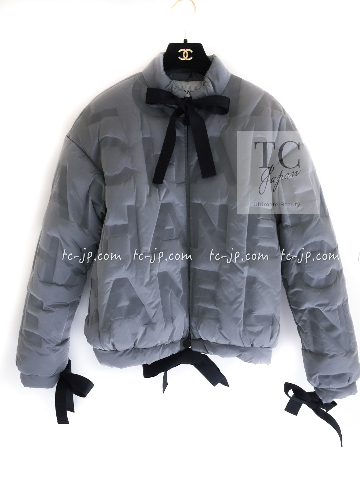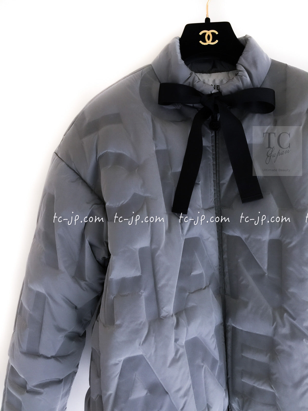 CHANEL 17B Light Grey Black Bow Logo Down Coat Jacket 34 36 38 シャネル ライトグレー ブラック リボン ロゴ ダウン ジャケット コート 即発