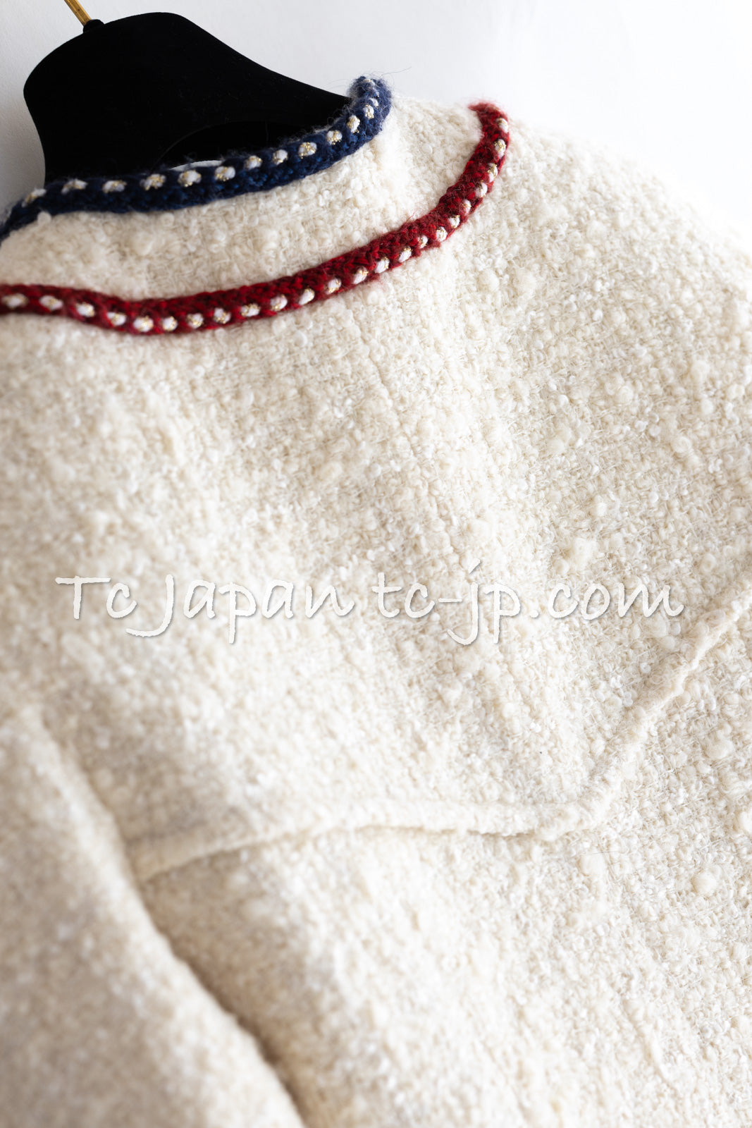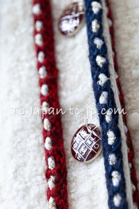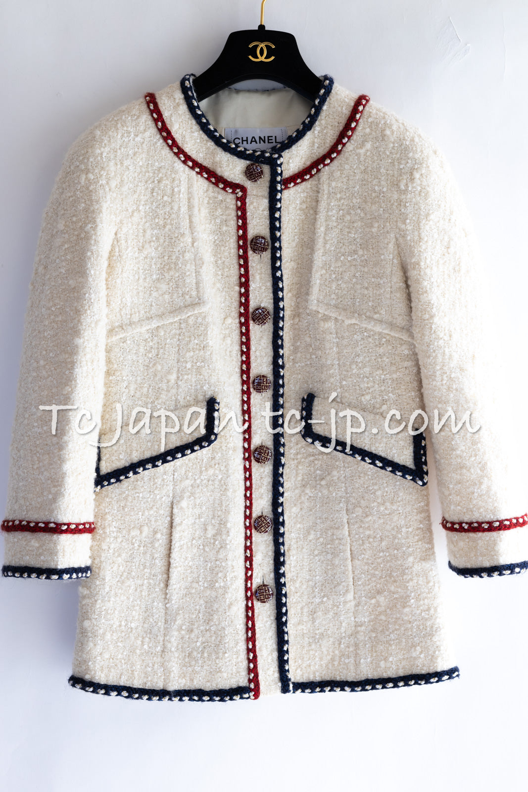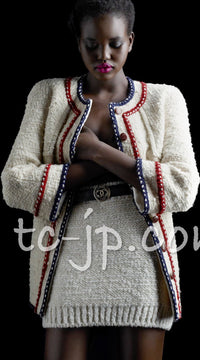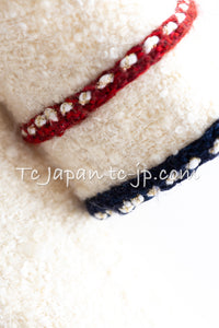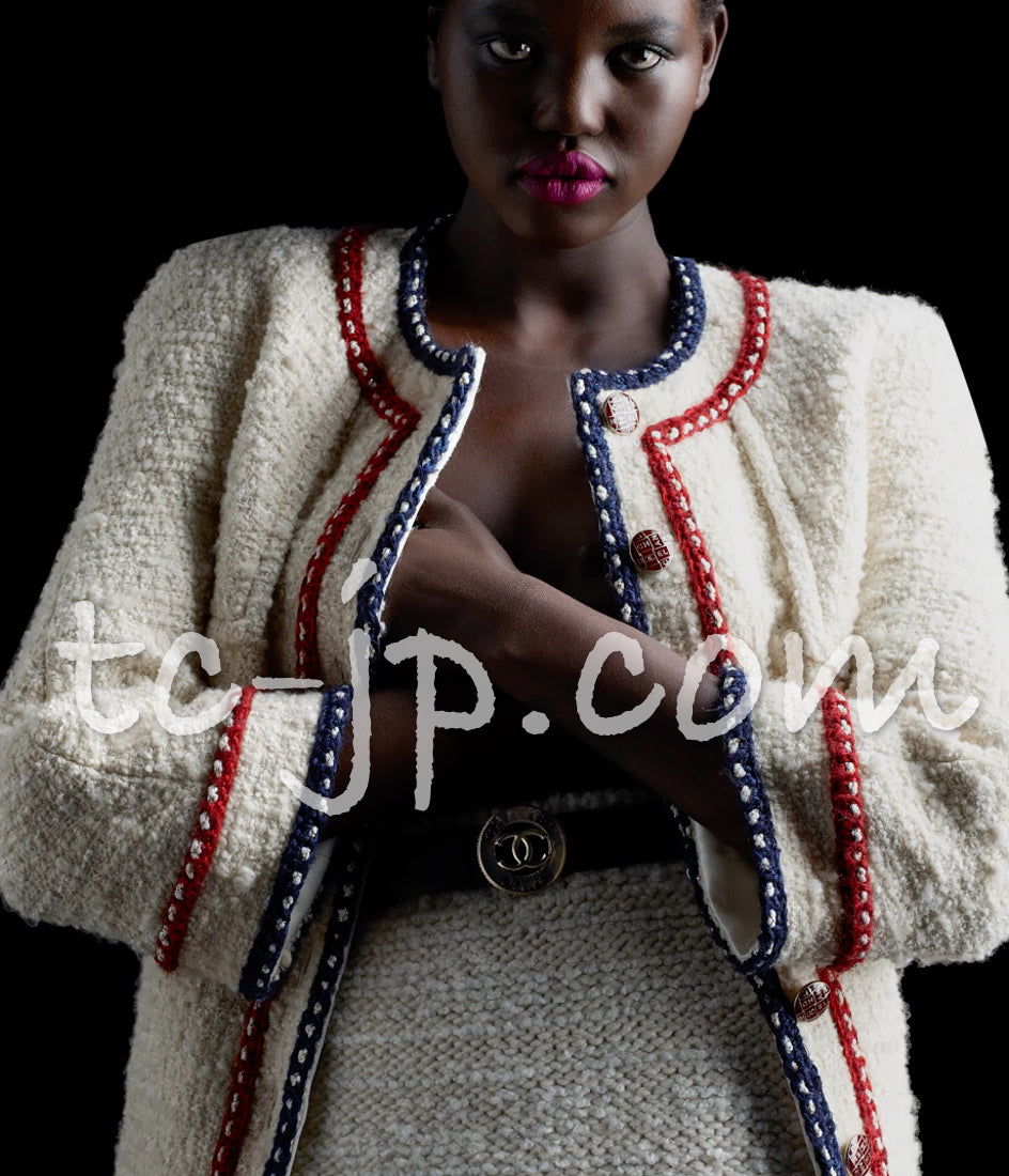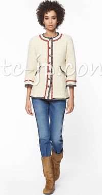 CHANEL 18PA Ivory Navy Red Tricolor Braid Trim Wool Tweed Jacket Coat 36 38 シャネル アイボリー ネイビー レッド トリコロール ブレード トリム ウール ジャケット コート 即発