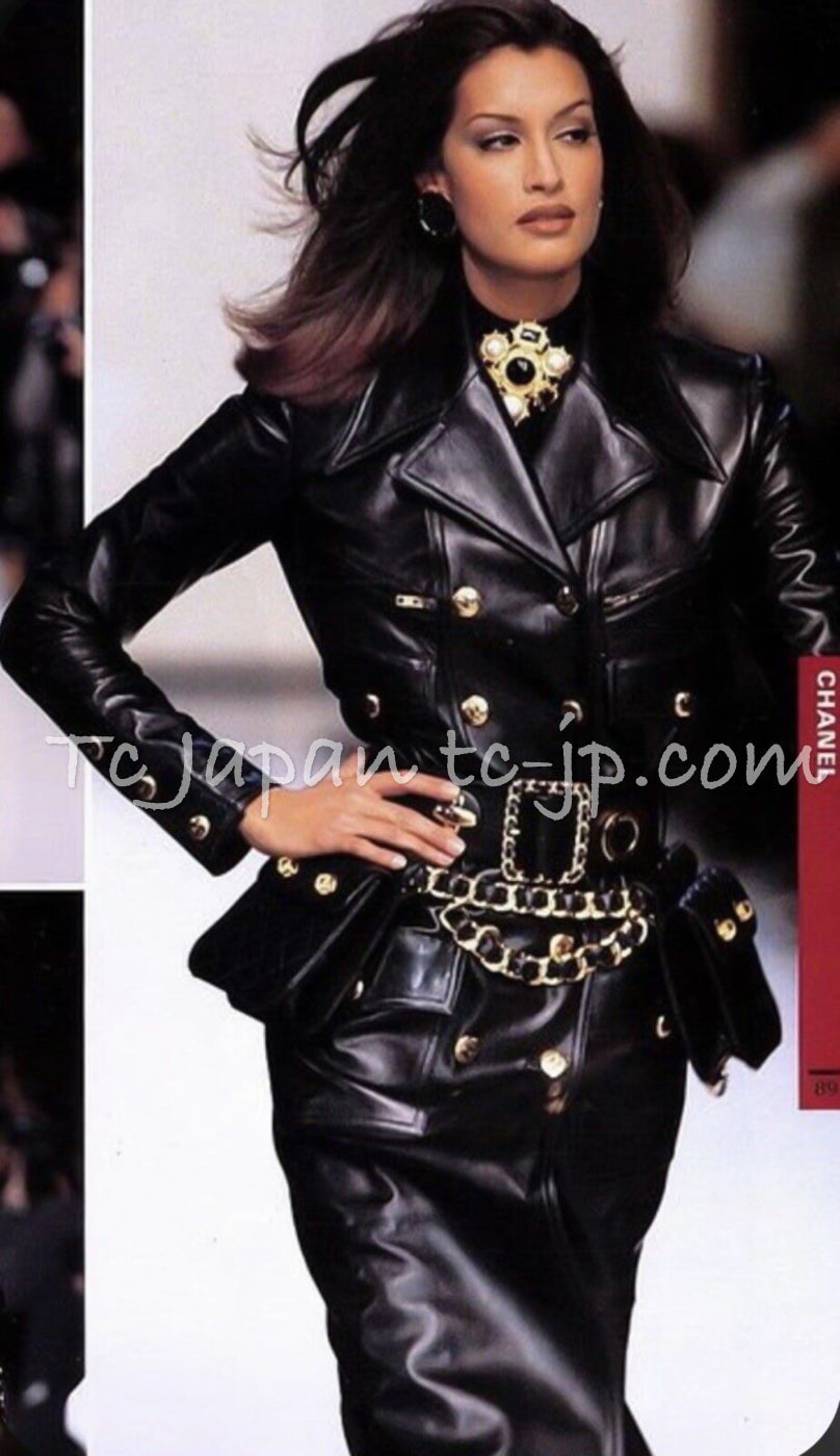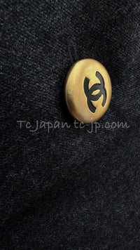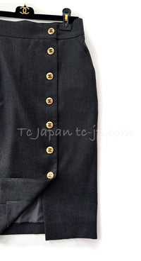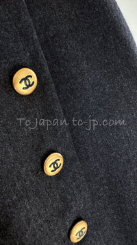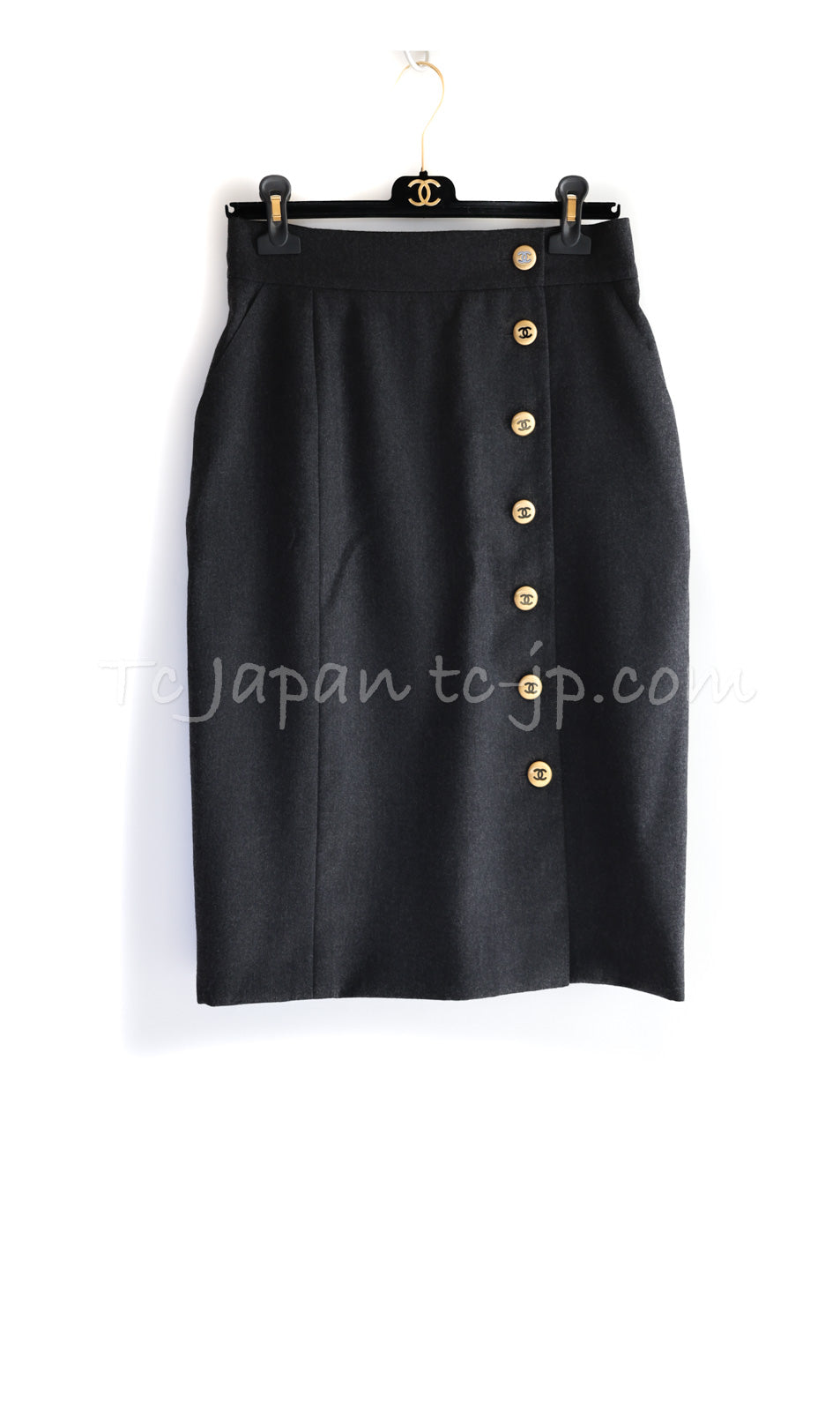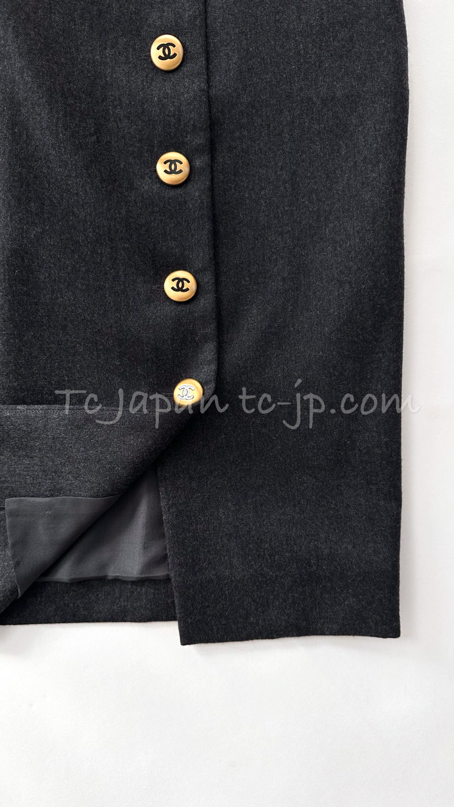CHANEL 92A Vintage Charcoal Gray Gold Big CC Button Wool Wrap Skirt 42 シャネル ヴィンテージ 貴重 チャコール グレー ウール ビッグ CC 立体ボタン ラップ巻き スカート 即発
