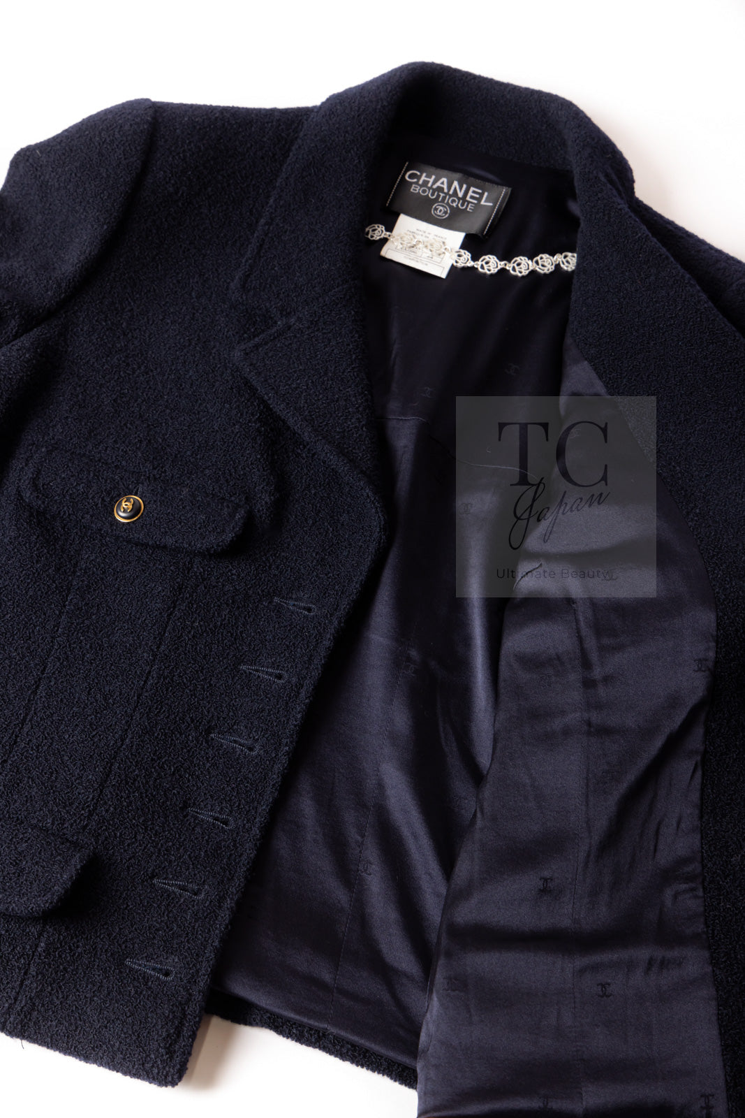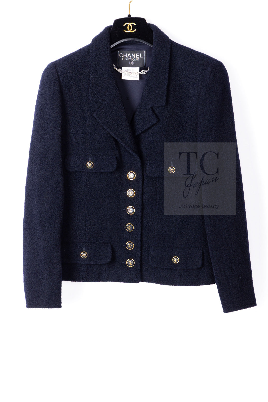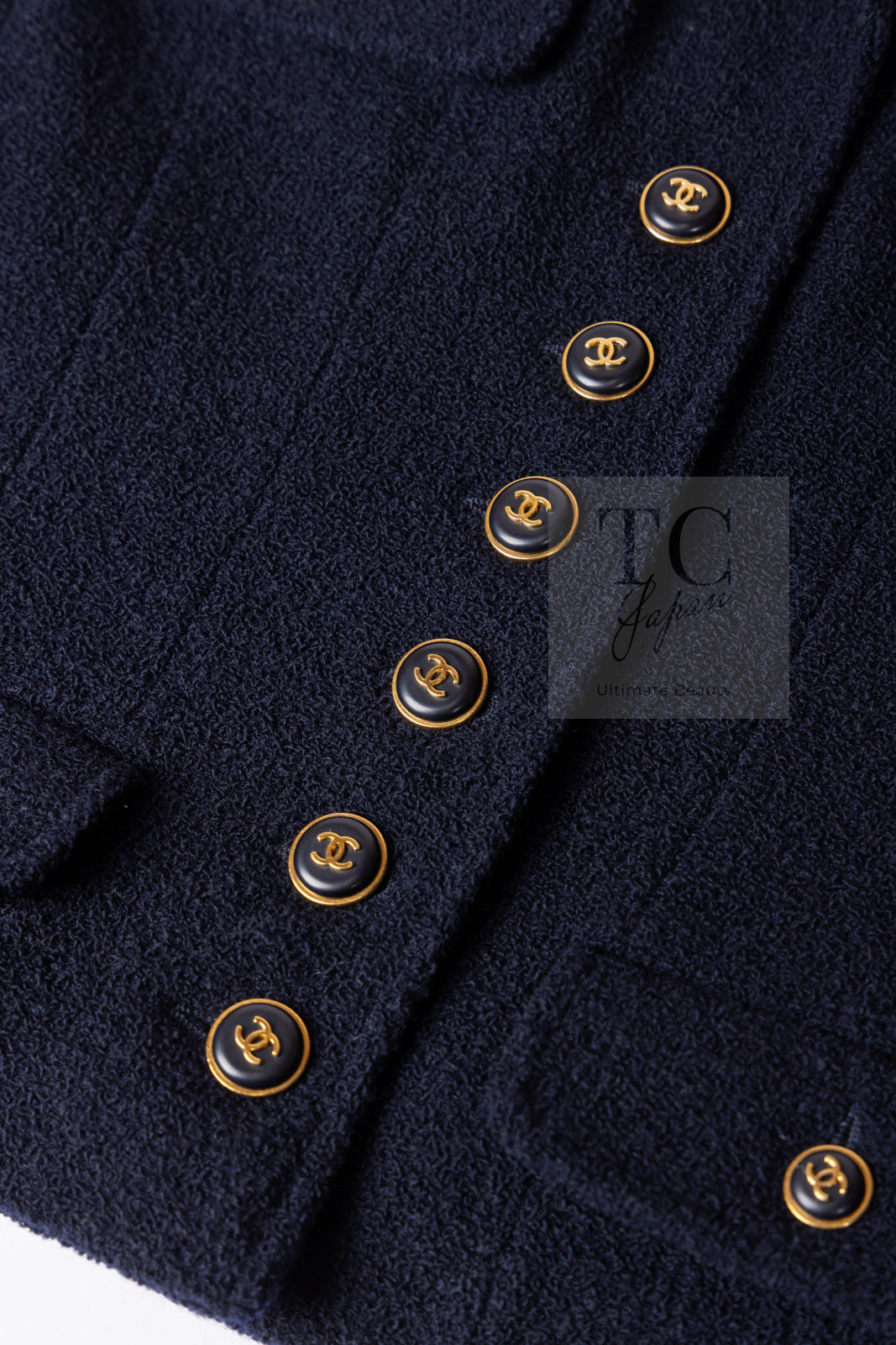 CHANEL 95A Vintage Dark Navy CC Buttons Wool Tweed Jacket Skirt Suit 44 シャネル ヴィンテージ ダーク ネイビー ココボタン ウール ダブル ツイード ジャケット スカート スーツ 即発