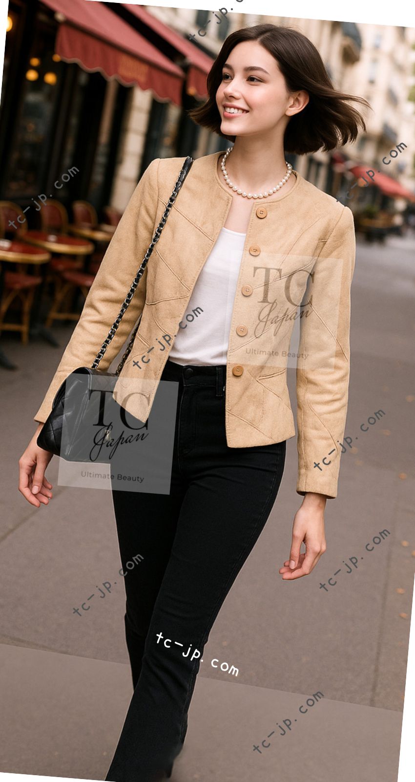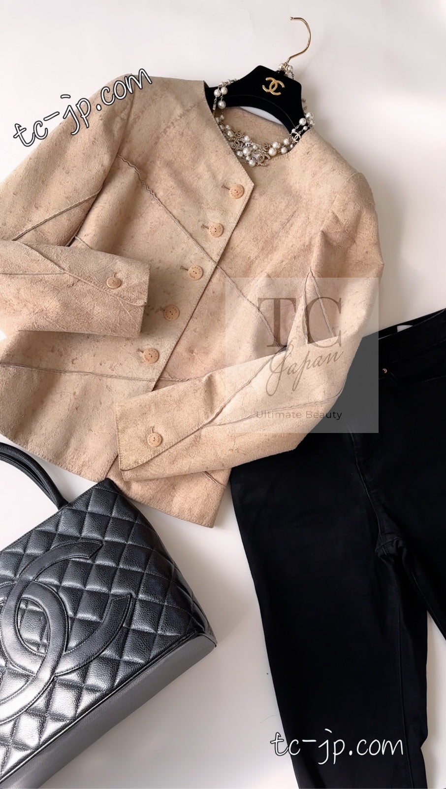 CHANEL 00C Beige Calf Skin Suede Leather Collarless Jacket 34 36 シャネル ベージュ カーフスキン スウェード レザー ノーカラー ジャケット 即発