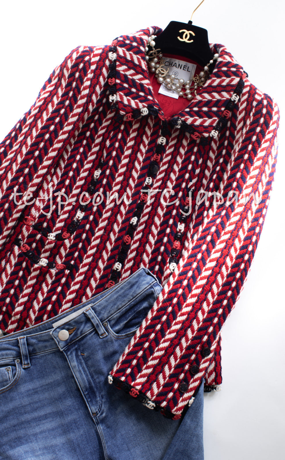 CHANEL 04A Red Navy Tricolore Wool Tweed Many CC Logo Trim Jacket 36 ④ シャネル レッド トリコロール ウール 限定版 コレクティブル ツイード ジャケット CCマーク多数 カメリアブローチ付 即発