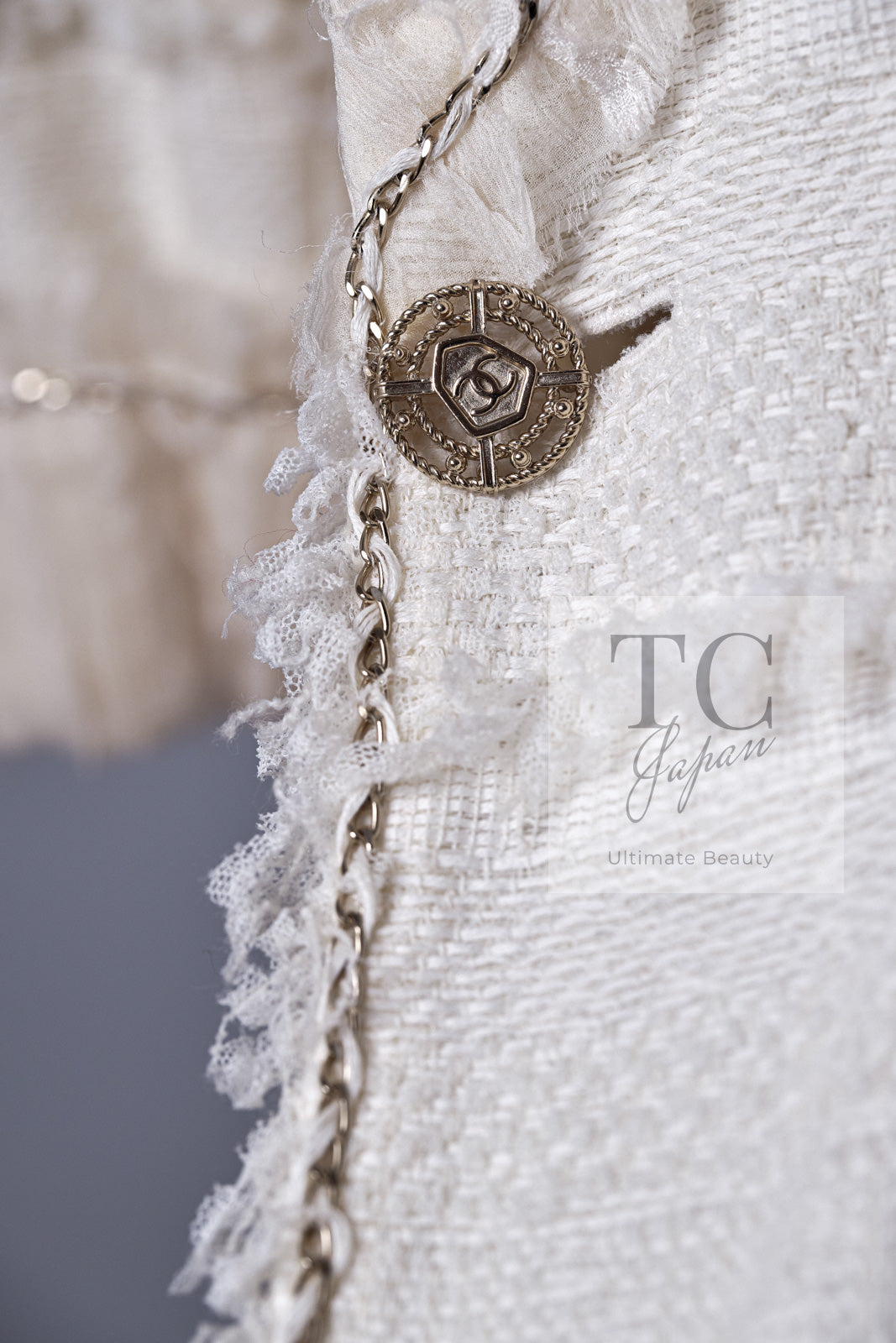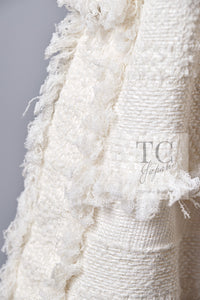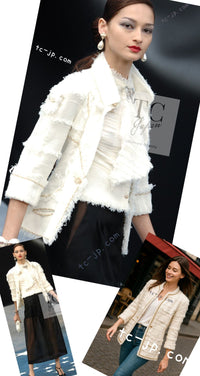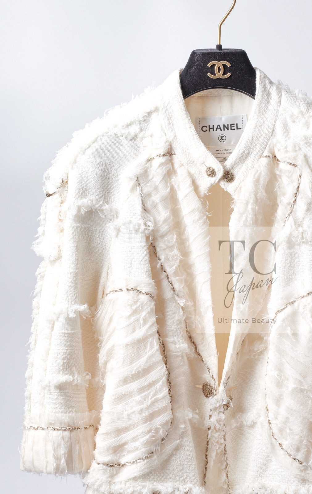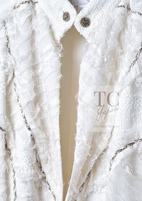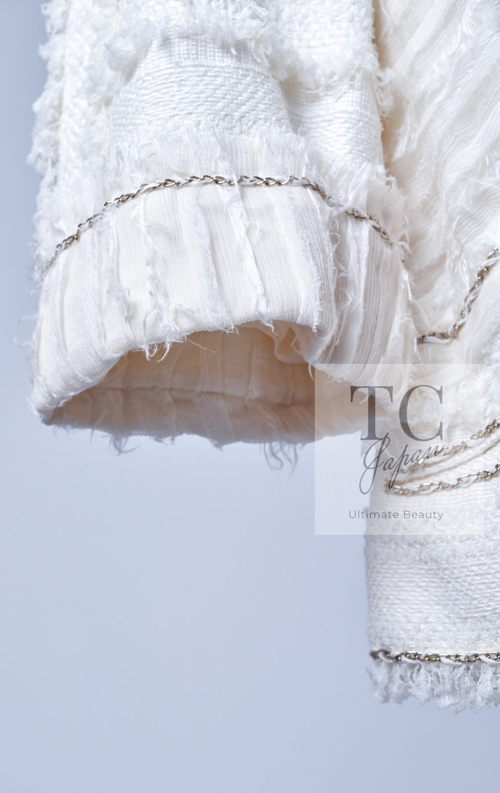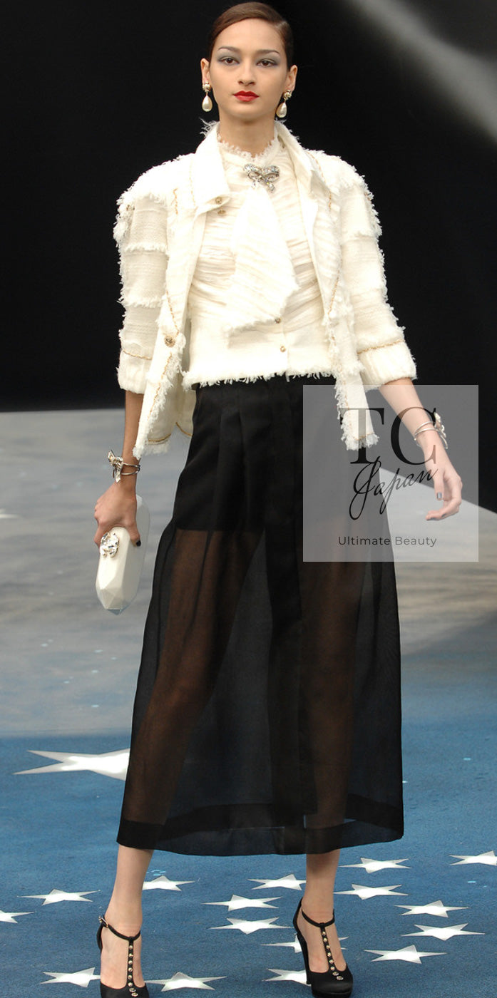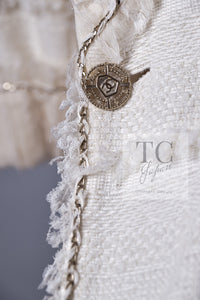 CHANEL 08S Ivory Creme Cotton Silk Chiffon Chain Trim Jacket 42 シャネル アイボリー クリーム コットン シルク シフォン チェーン トリム ジャケット 即発