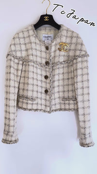 CHANEL 11A Ivory Creme Chain Braid Trimming Collarless Tweed Jacket 40 シャネル アイボリー クリーム チェーン ブレイド トリム ノーカラー ツイード ジャケット 即発