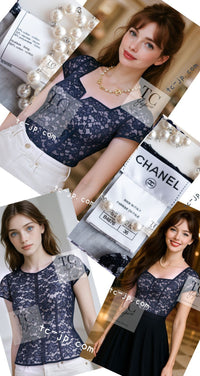 CHANEL 14C Navy White Camellia Lace Tops 36 シャネル ネイビー ホワイト カメリア レース トップス 即発