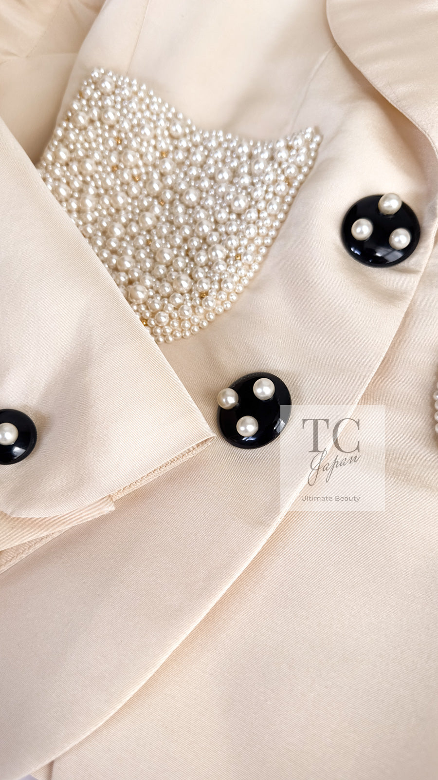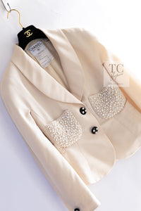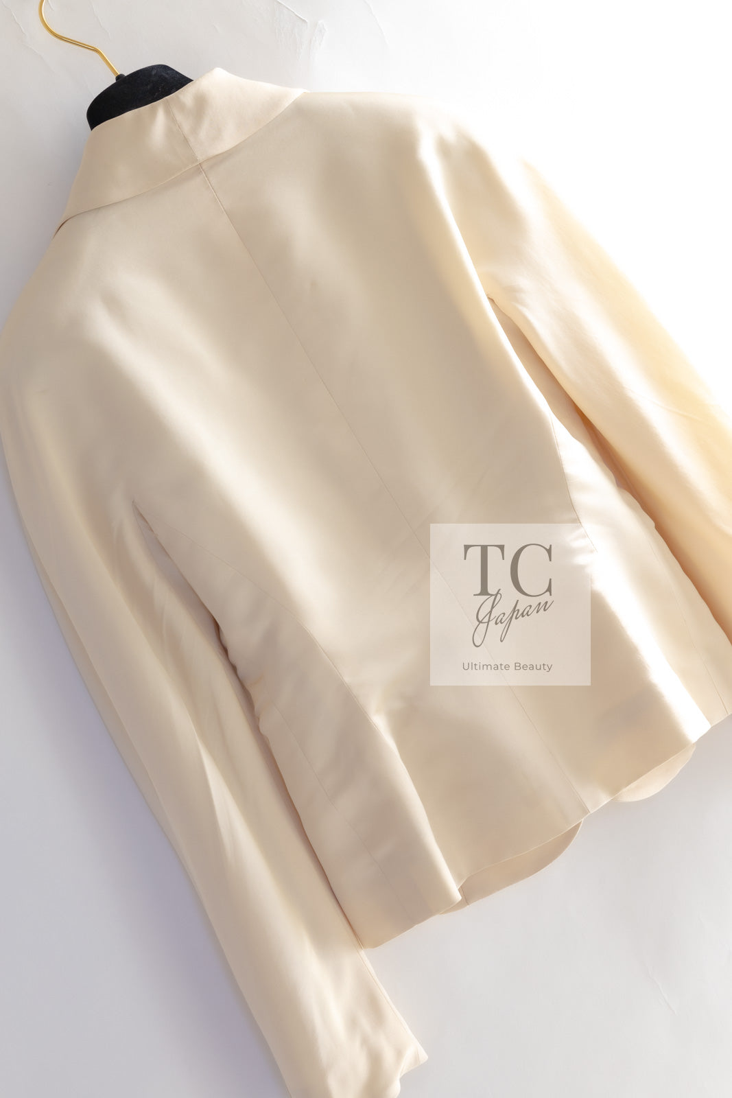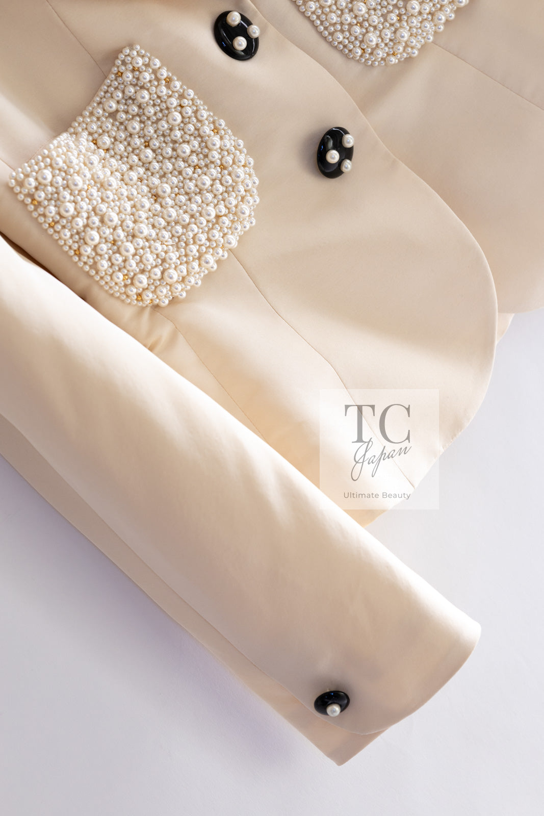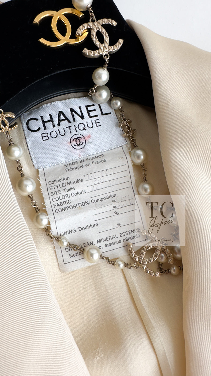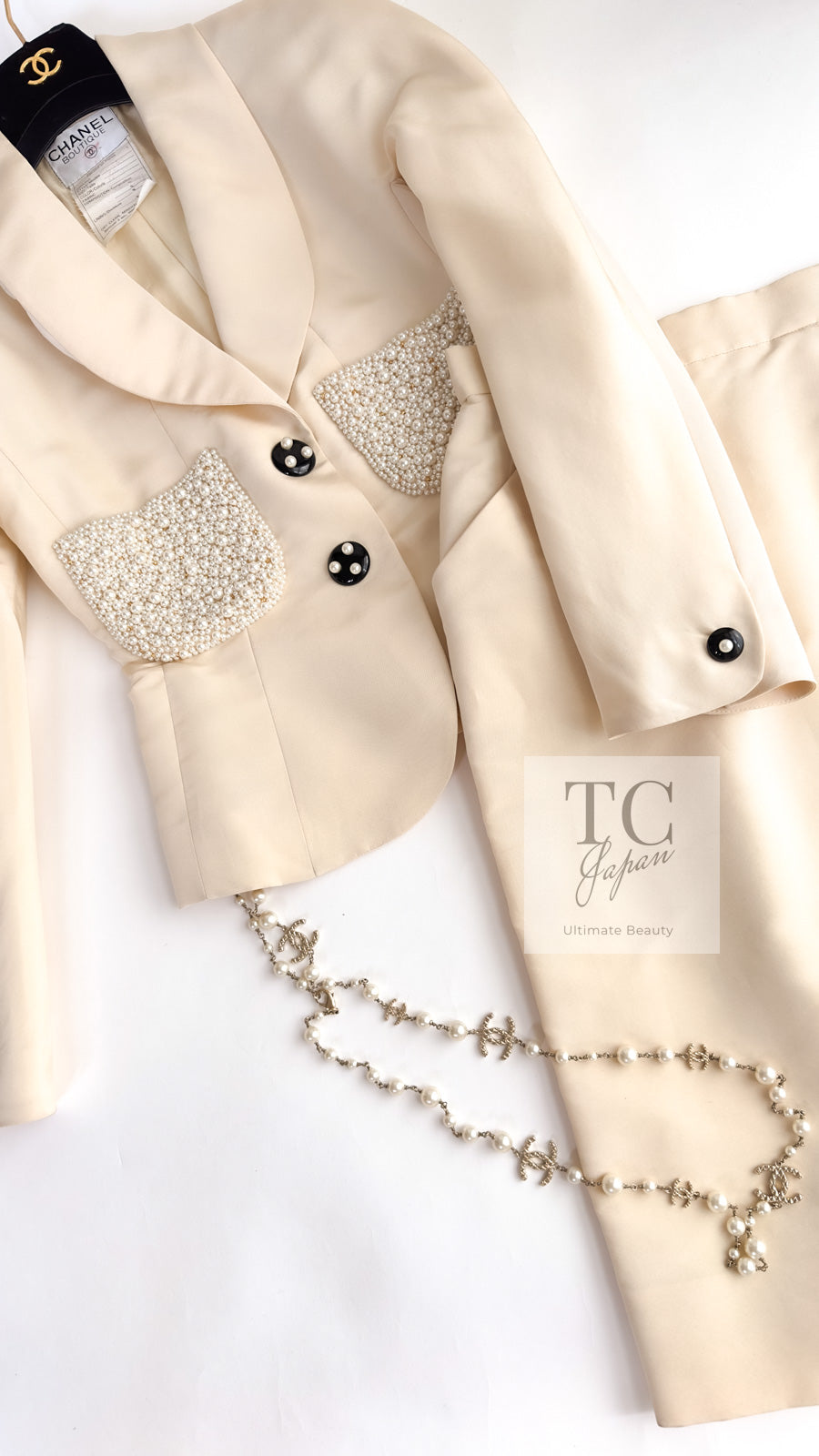 CHANEL 90S Vintage Ivory Cream Pearl Pocket Silk Skirt Jacket Suit 38 シャネル ヴィンテージ アイボリー クリーム パールいっぱい シルク スカート ジャケット スーツ 即発