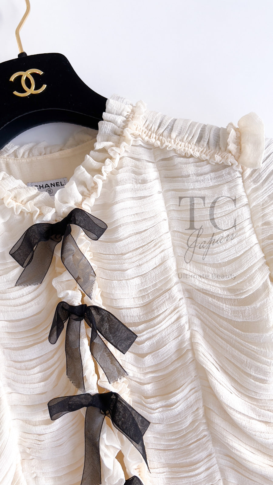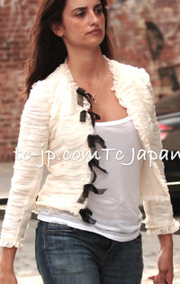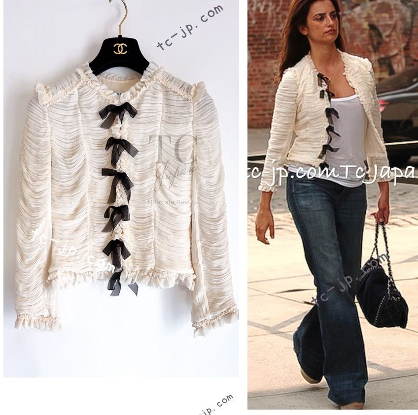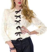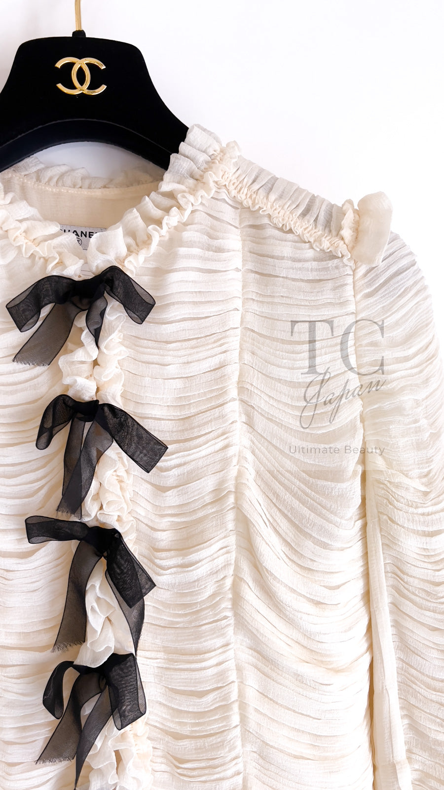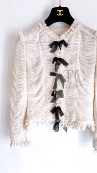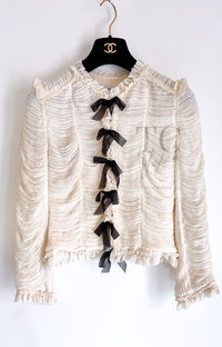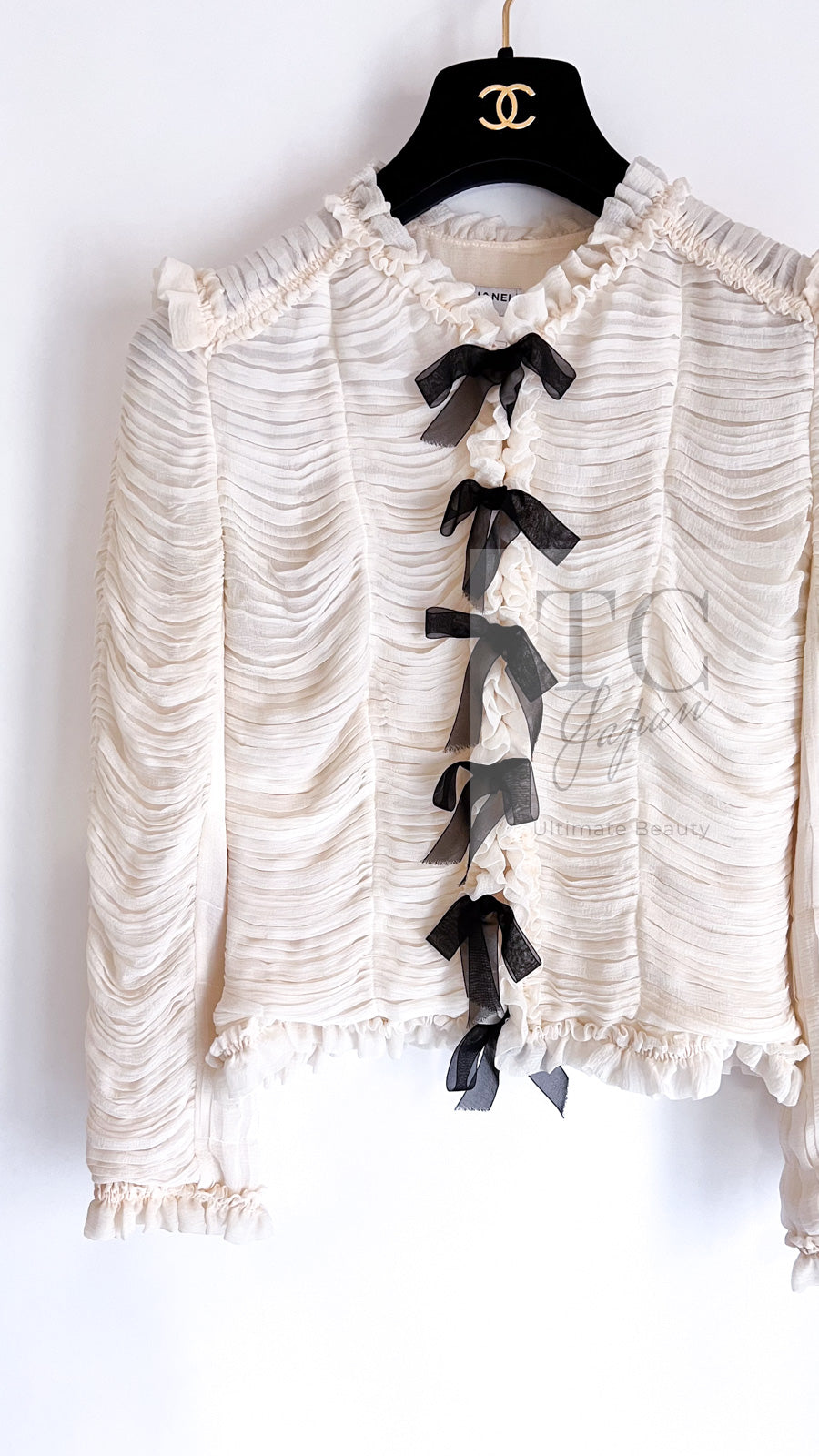 CHANEL 06A Creme Ivory Ribbon Silk Cardigan Jacket Top 34 36 38 シャネル クリーム アイボリー リボン シルク ブラウス カーディガン ジャケット 即発