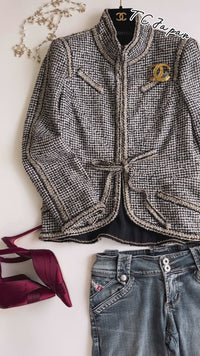 CHANEL 10C Black Ivory Gold Stand Collar Tweed Jacket Skirt Suit 34 40 シャネル ブラック アイボリー ゴールド スタンドカラー ツイード ジャケット スカート スーツ 即発