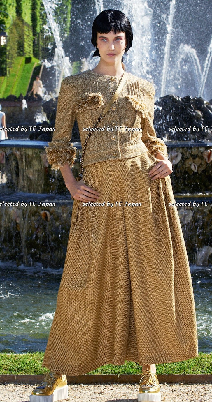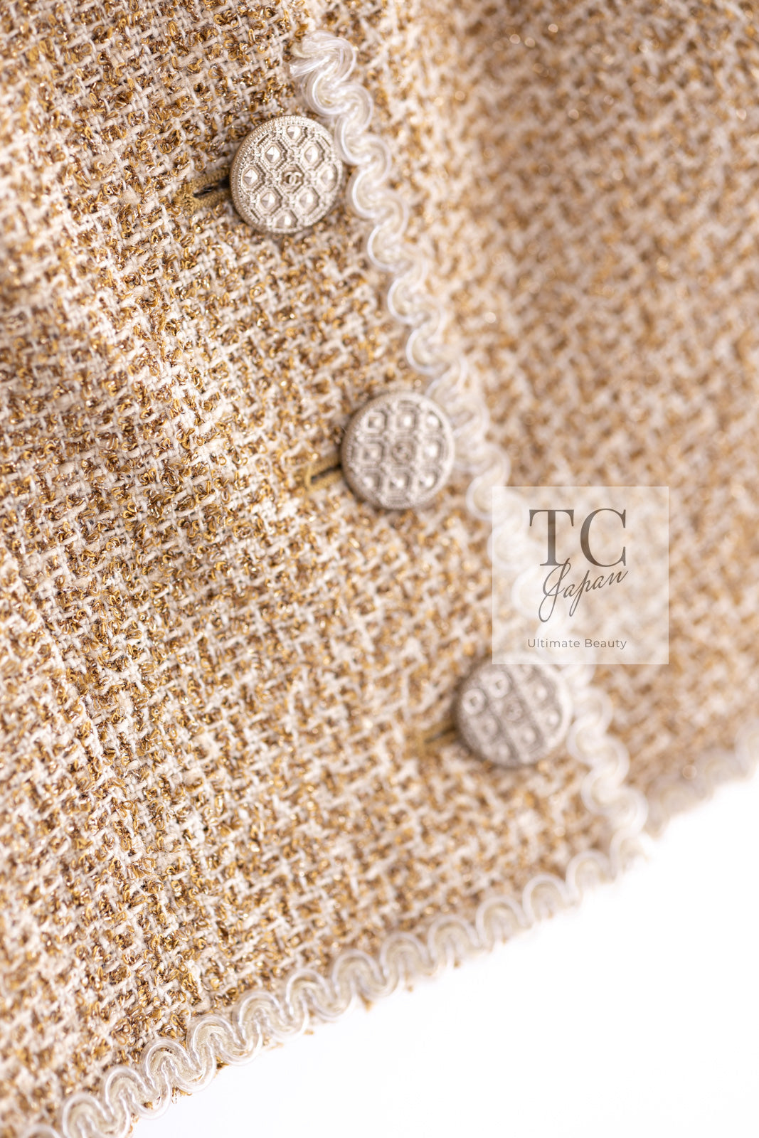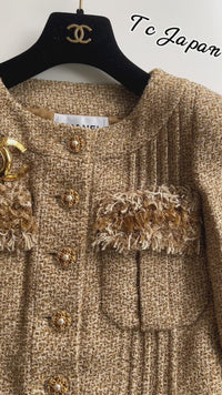 CHANEL 13C Gold Silk Fringe Collarless Tweed Jacket Skirt Suit 38 シャネル ゴールド シルク フリンジ ノーカラー ツイード ジャケット スカート スーツ 即発