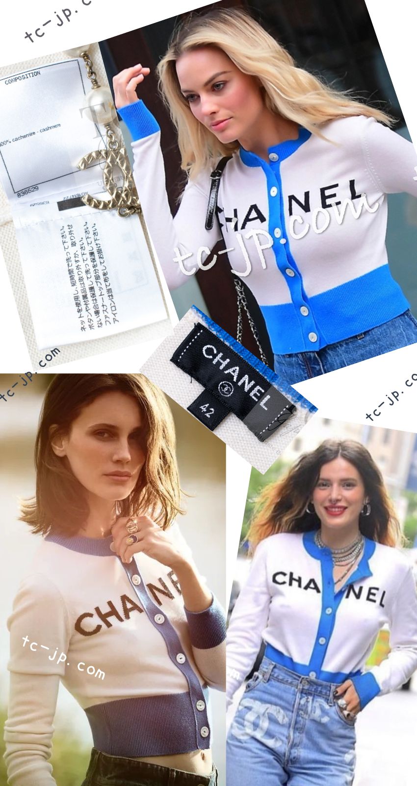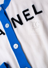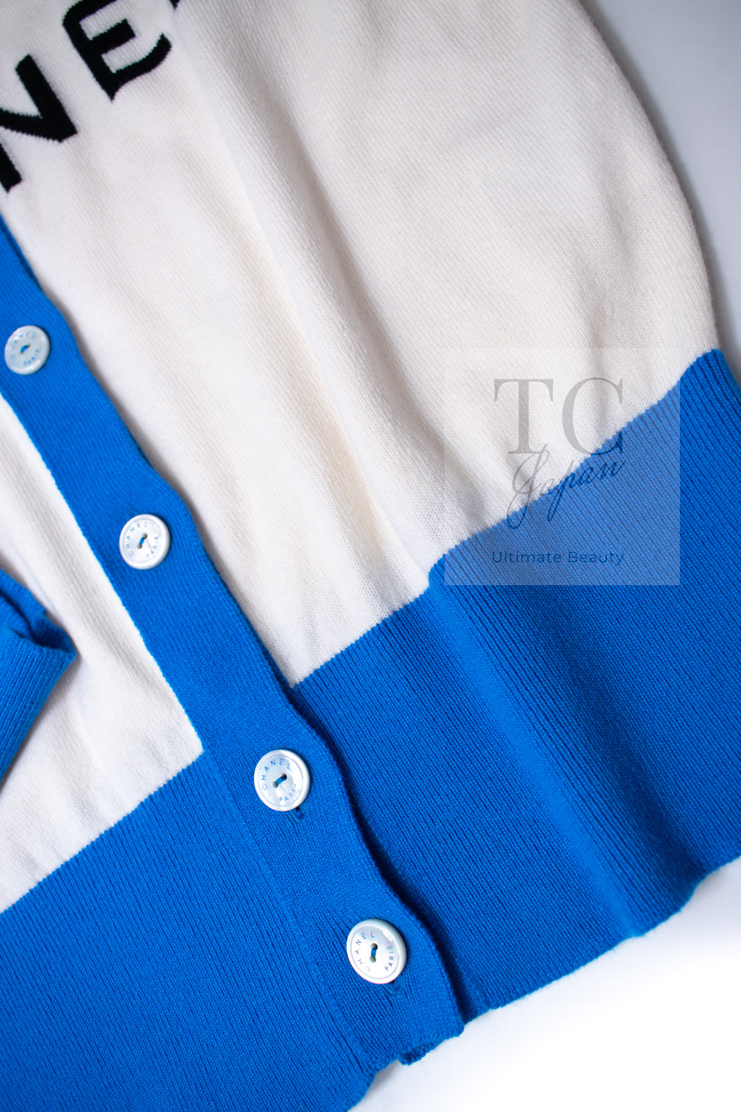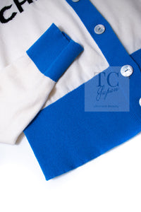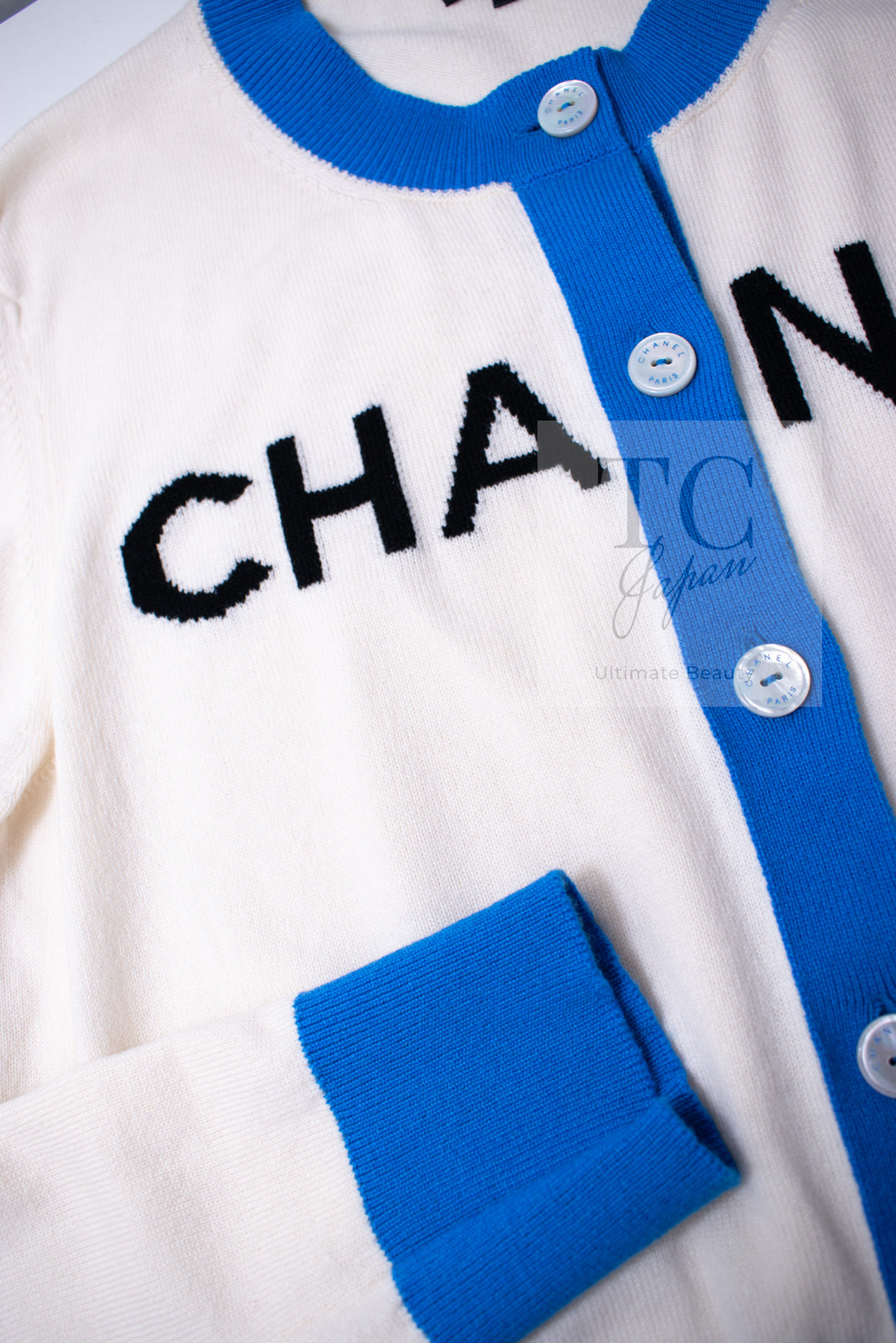 CHANEL 19S Ivory Blue Line Logo Cashmere Knit Cardigan 42 シャネル アイボリー ブルー バイカラー ロゴ カシミヤ 100% ニット カーディガン 即発