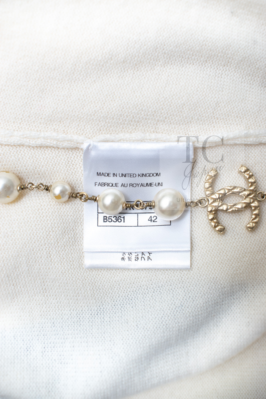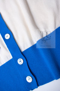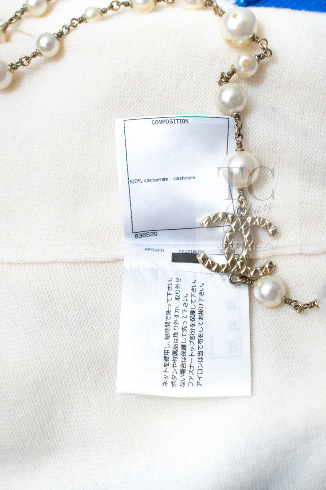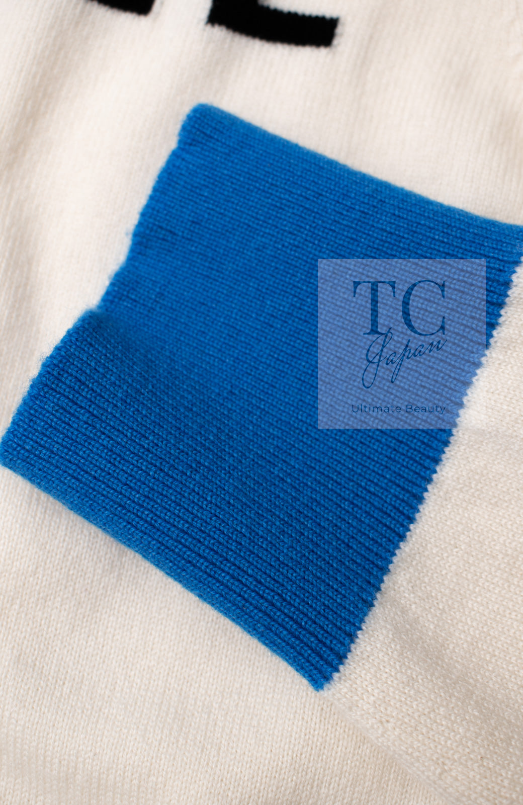 CHANEL 19S Ivory Blue Line Logo Cashmere Knit Cardigan 42 シャネル アイボリー ブルー バイカラー ロゴ カシミヤ 100% ニット カーディガン 即発