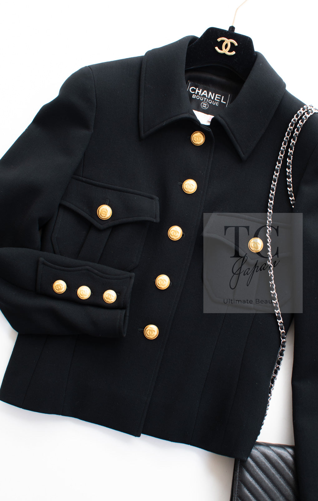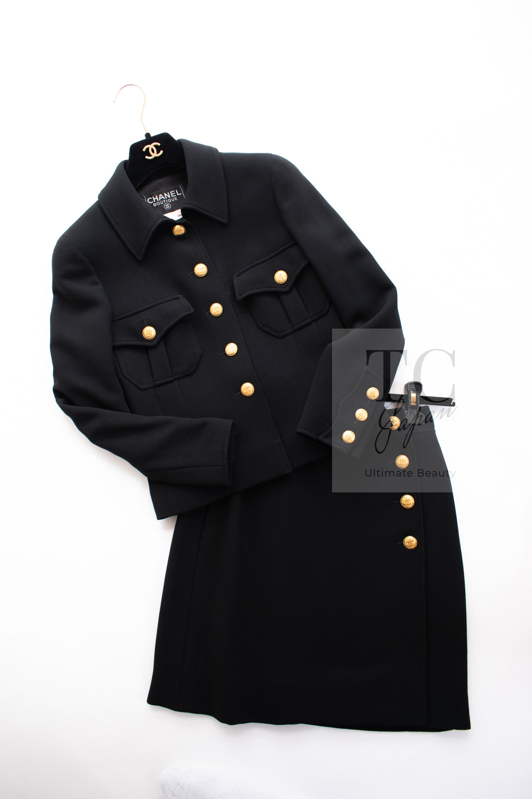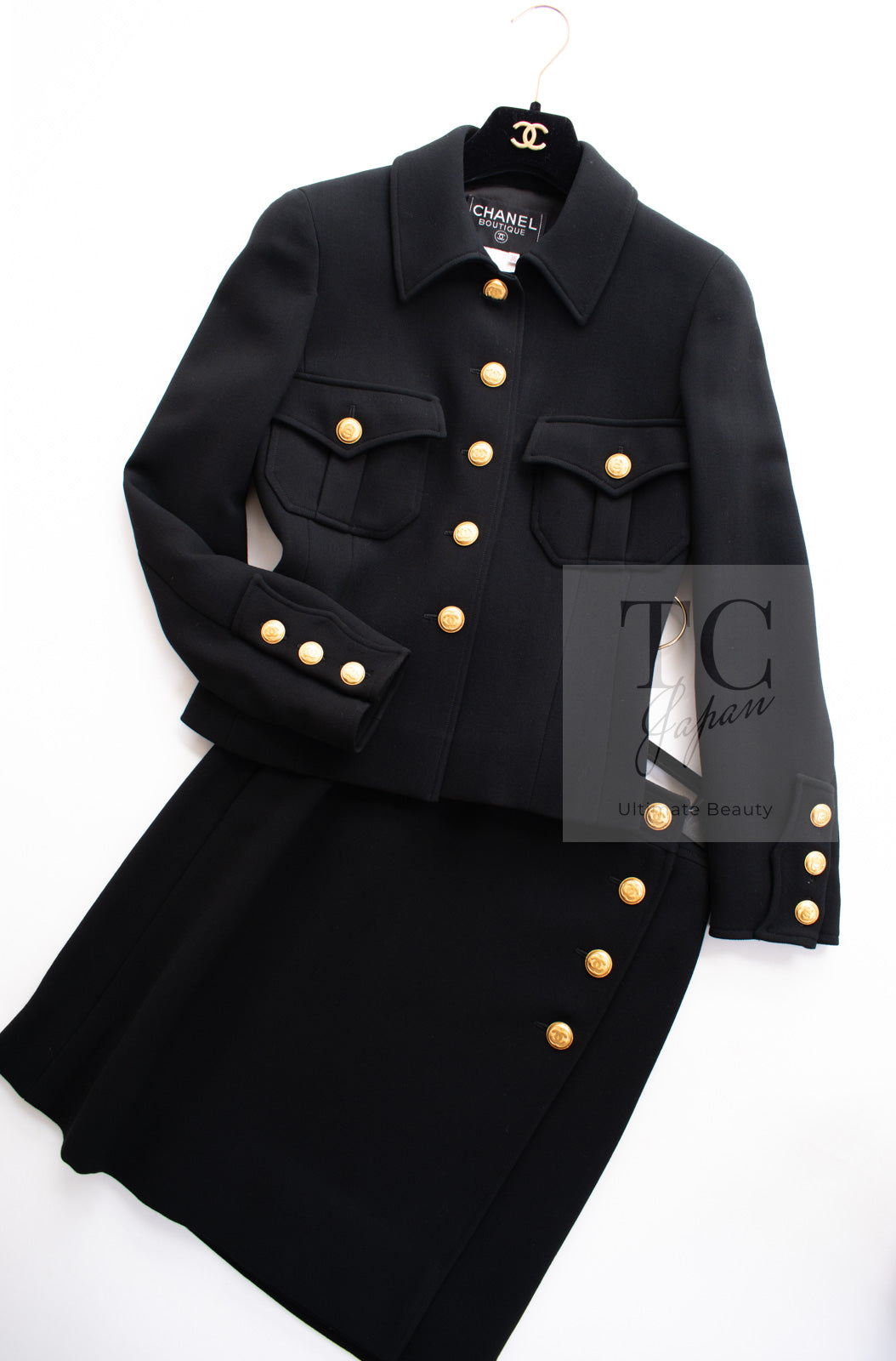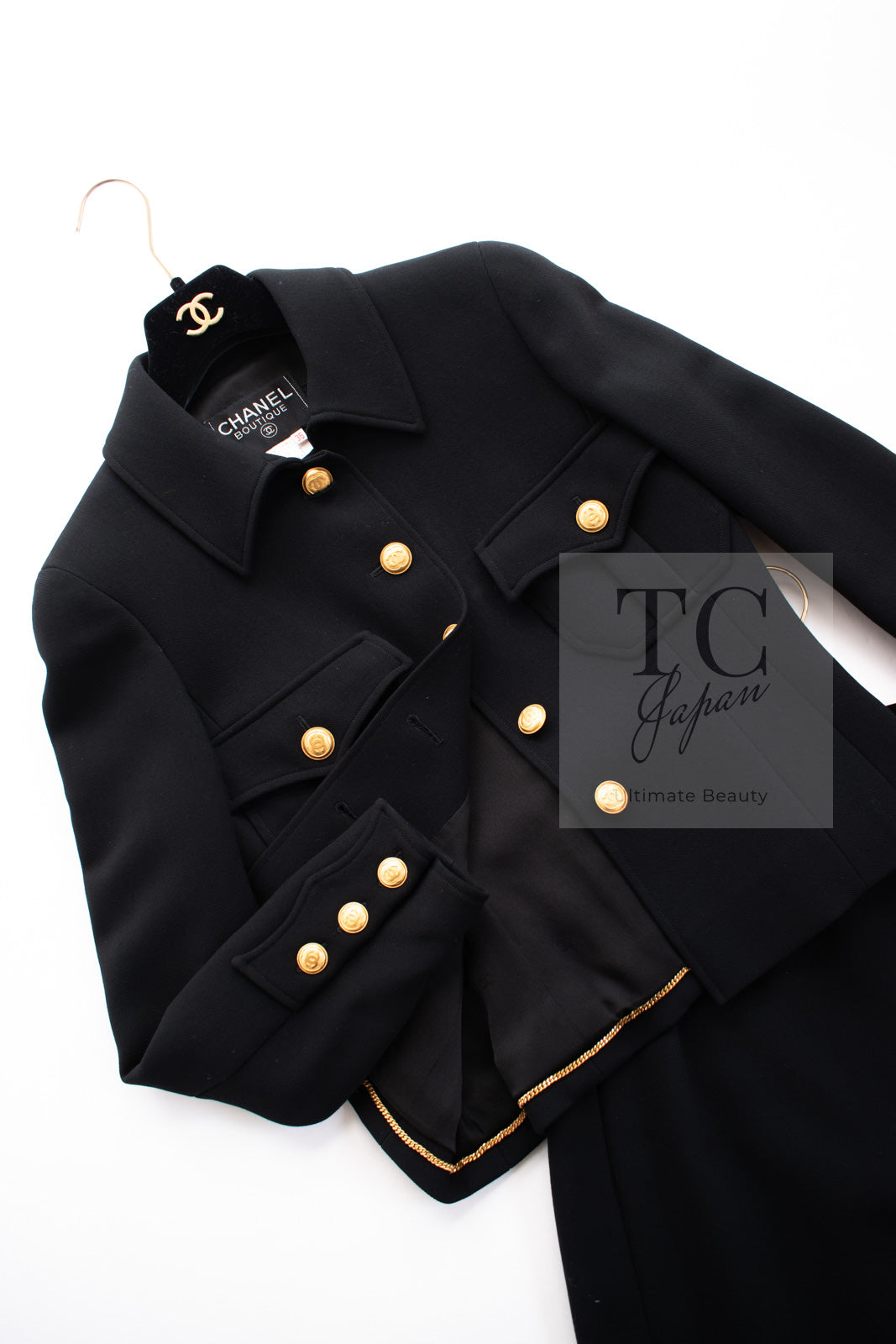 CHANEL 96A Vintage Black Wool 100 Gold CC Logo Buttons Military Jacket Skirt Suit 36 シャネル ヴィンテージ ブラック ウール 100% ゴールド CC ロゴ ボタン ミリタリー ジャケット スカート スーツ 即発