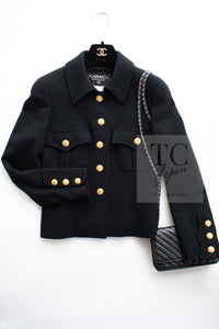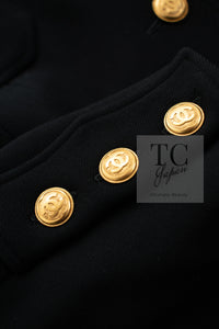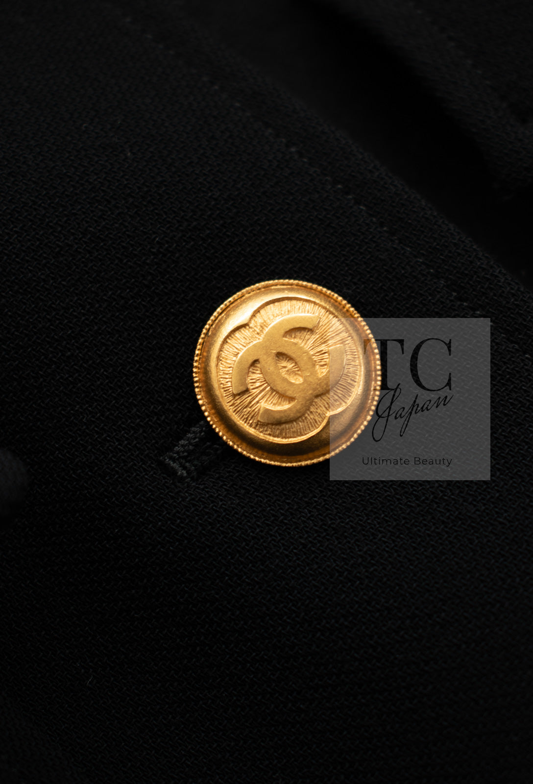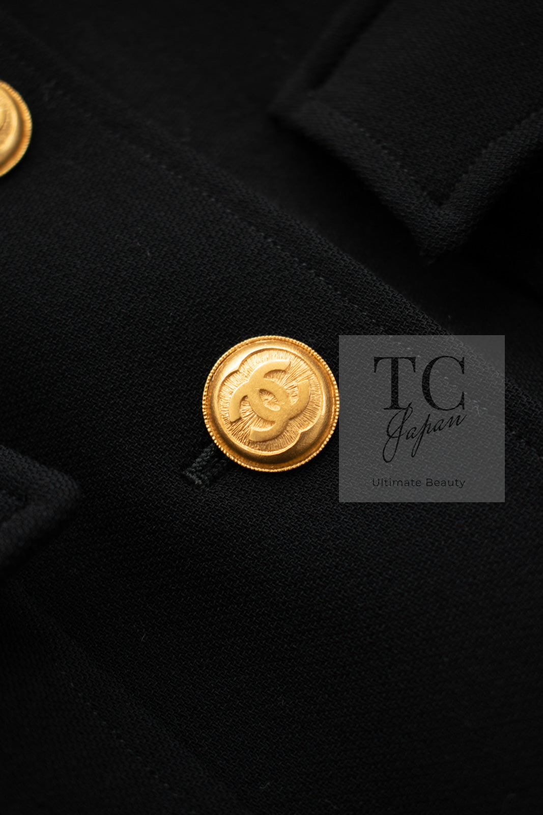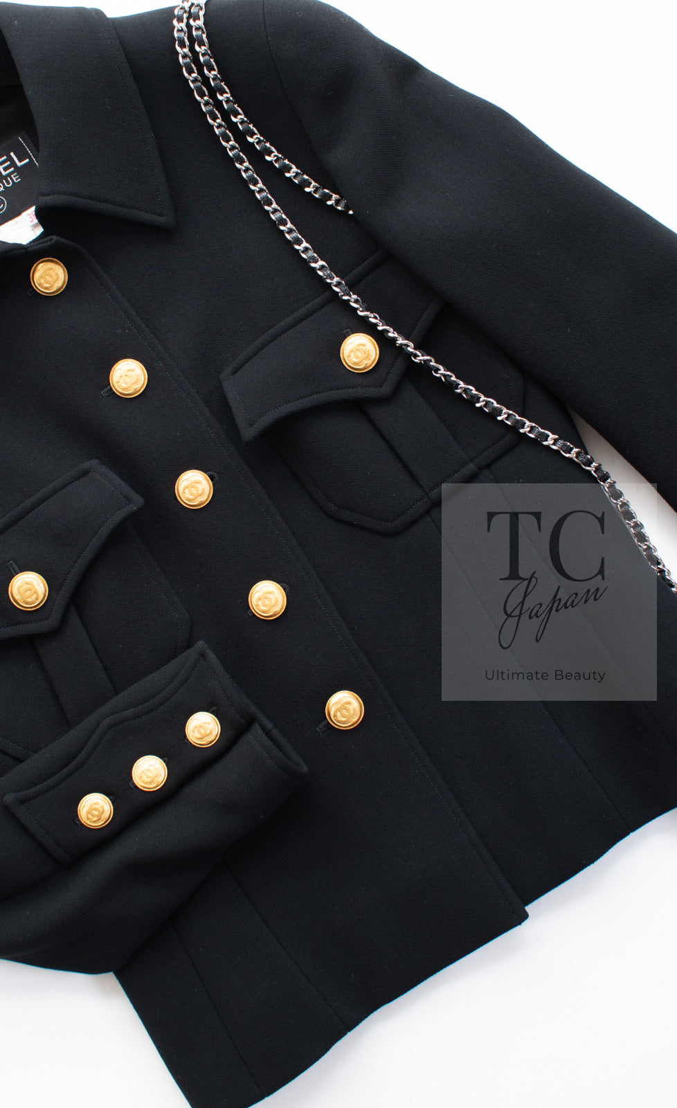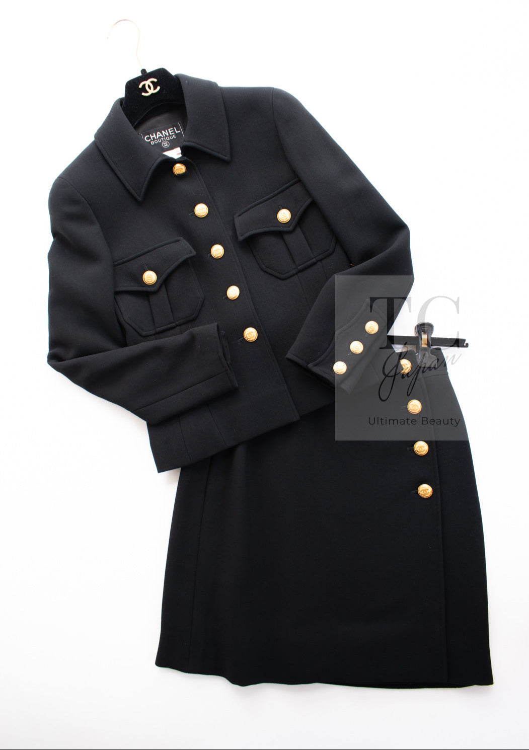 CHANEL 96A Vintage Black Wool 100 Gold CC Logo Buttons Military Jacket Skirt Suit 36 シャネル ヴィンテージ ブラック ウール 100% ゴールド CC ロゴ ボタン ミリタリー ジャケット スカート スーツ 即発