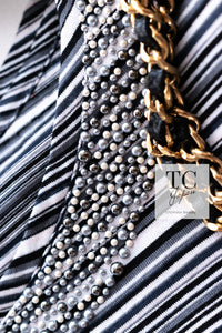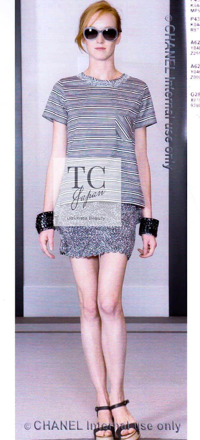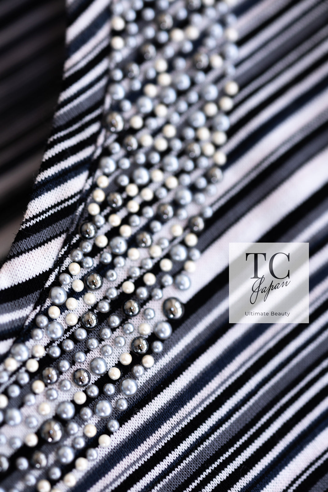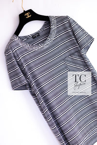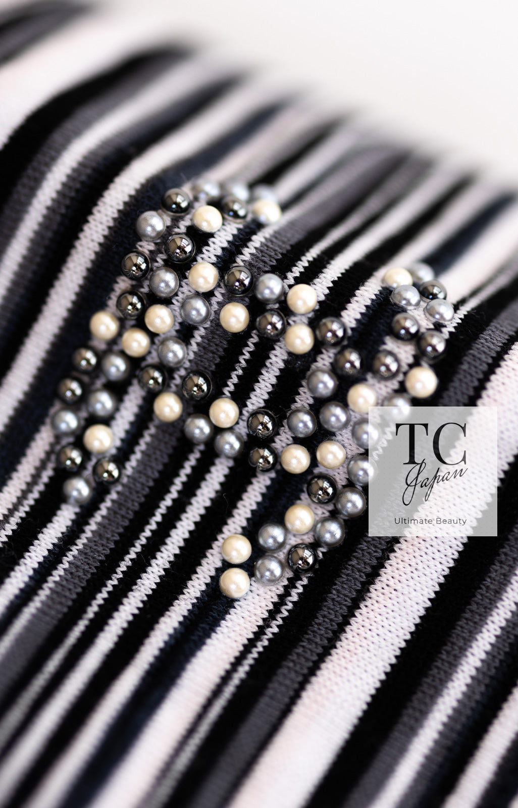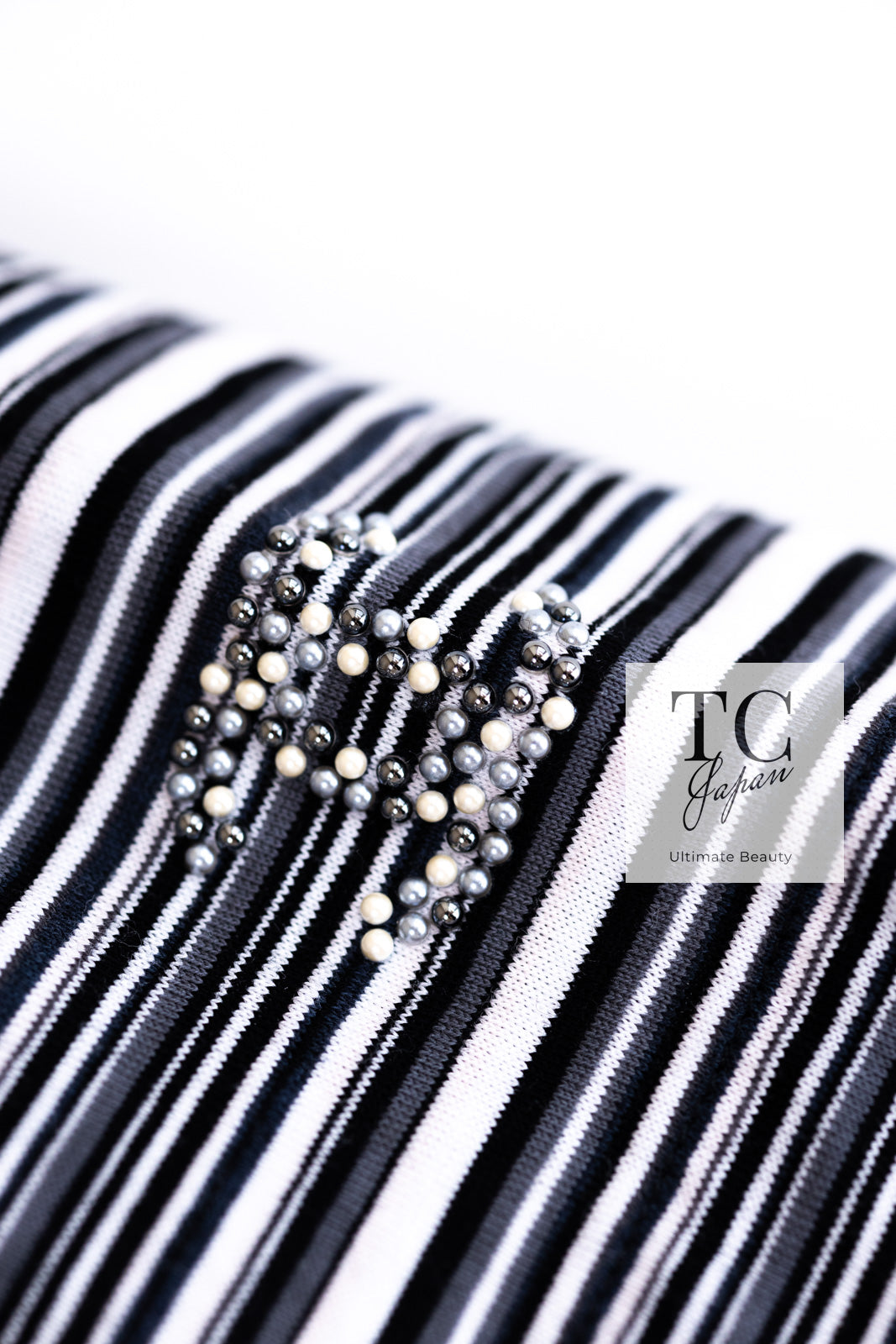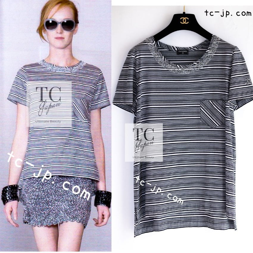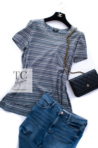 CHANEL 12S Gray Black White CC Mark Border Cotton T-shirt 40 シャネル グレー ブラック ホワイト ココマーク 半袖 ボーダー コットン ストーン装飾 Tシャツ 即発
