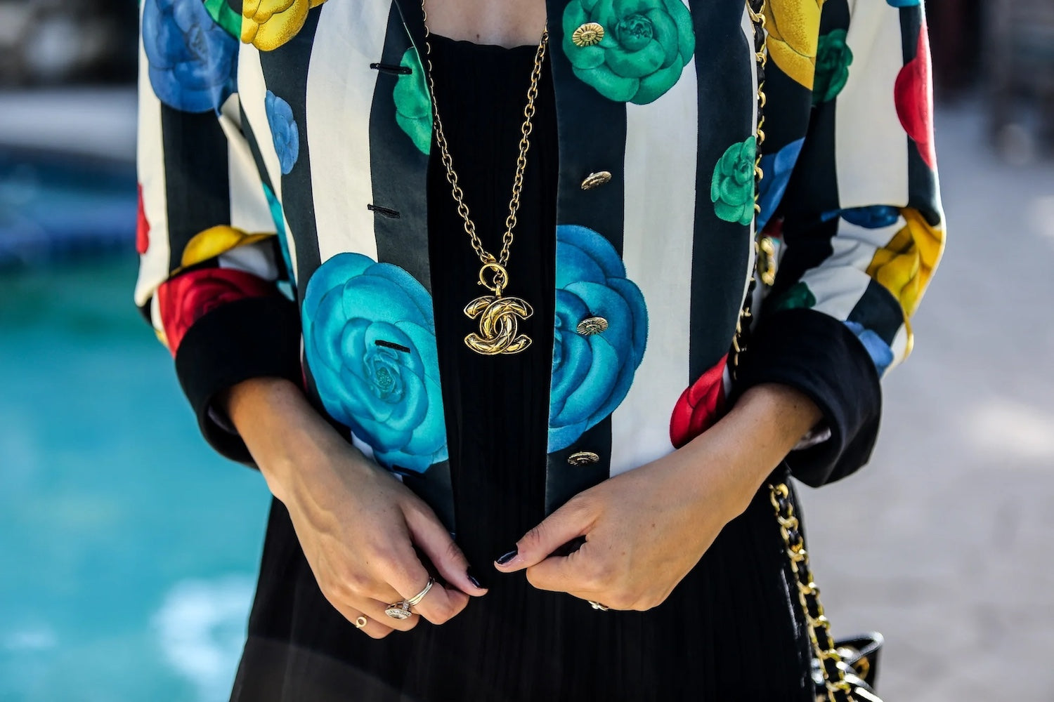 CHANEL 88S Vintage Black Bold Striped Camellia Print Cotton Runway Shirt Jacket 36 38 シャネル ヴィンテージ ブラック カラフル ストライプ カメリア コットン ランウェイ シャツ ジャケット 即発