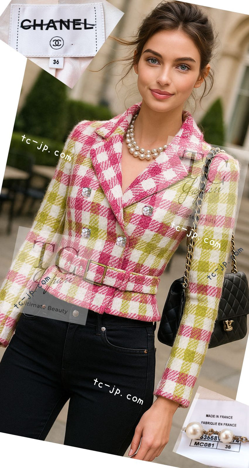 CHANEL 16S Pink Green White Belt Double Tweed Jacket 36 シャネル ピンク グリーン ホワイト ベルト ツイード ジャケット 即発