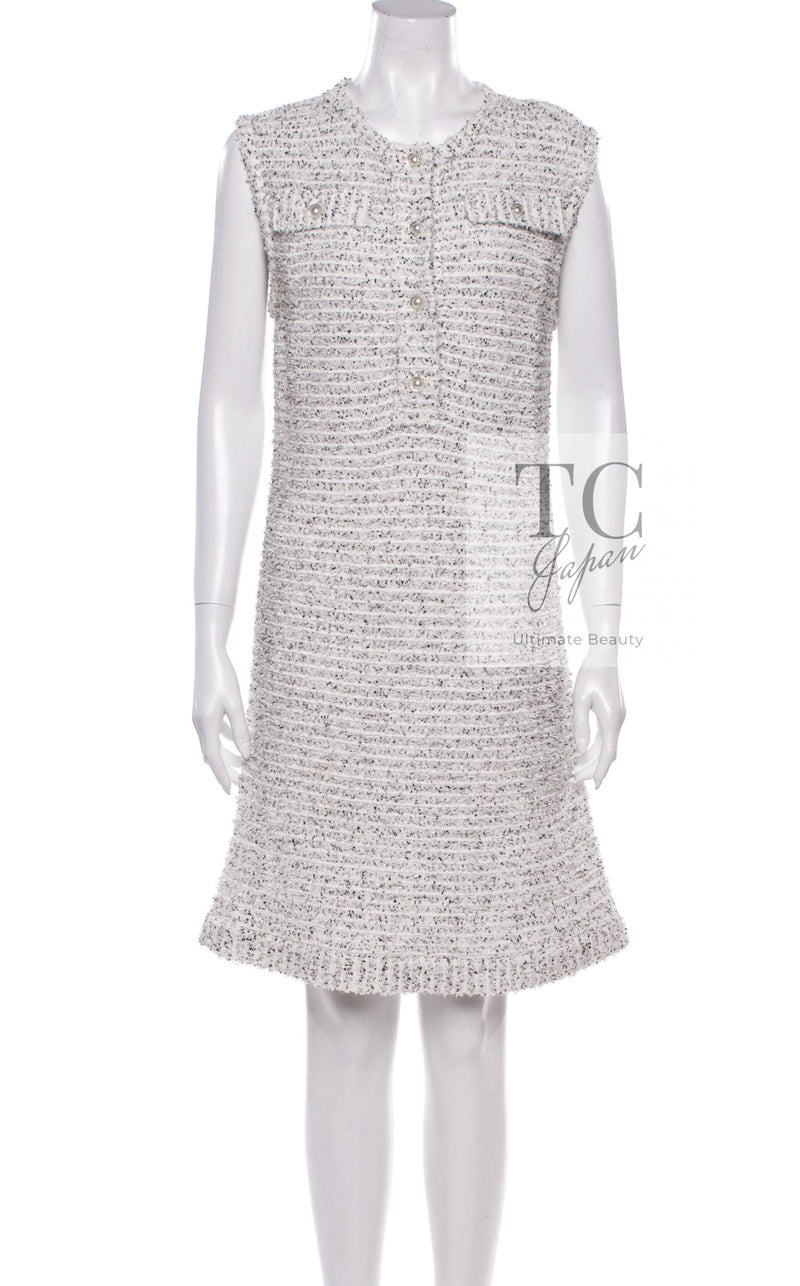 CHANEL 16PS White Gray Sleeveless CC Buttons Stretch Knit Dress 36 シャネル ホワイト グレー ストレッチ ノースリーブ CC ボタン ニット ワンピース 即発