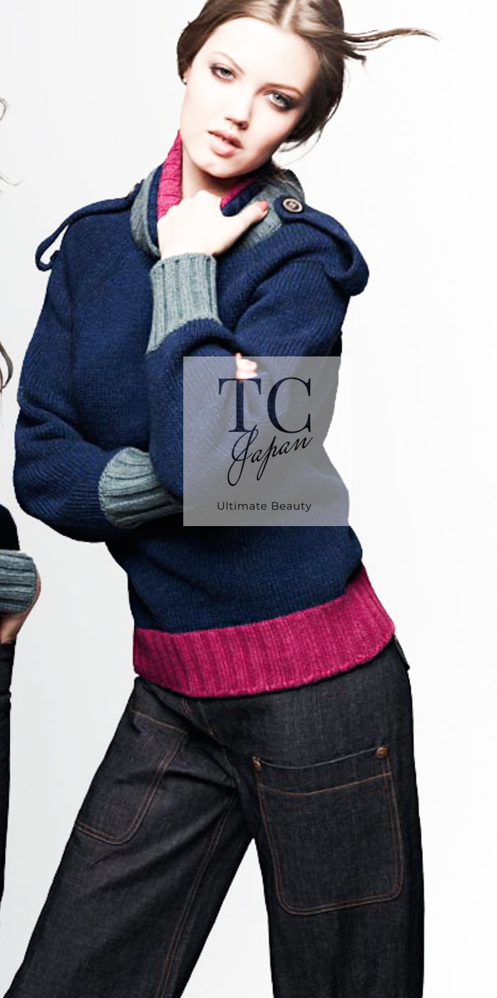 CHANEL 12A Navy Gray Pink Cashmere Wool Knit Sweater CC Logo Buttons 38 シャネル ネイビー グレー ピンク カシミヤ ウール モヘア ニット セーター ココマークボタン 即発