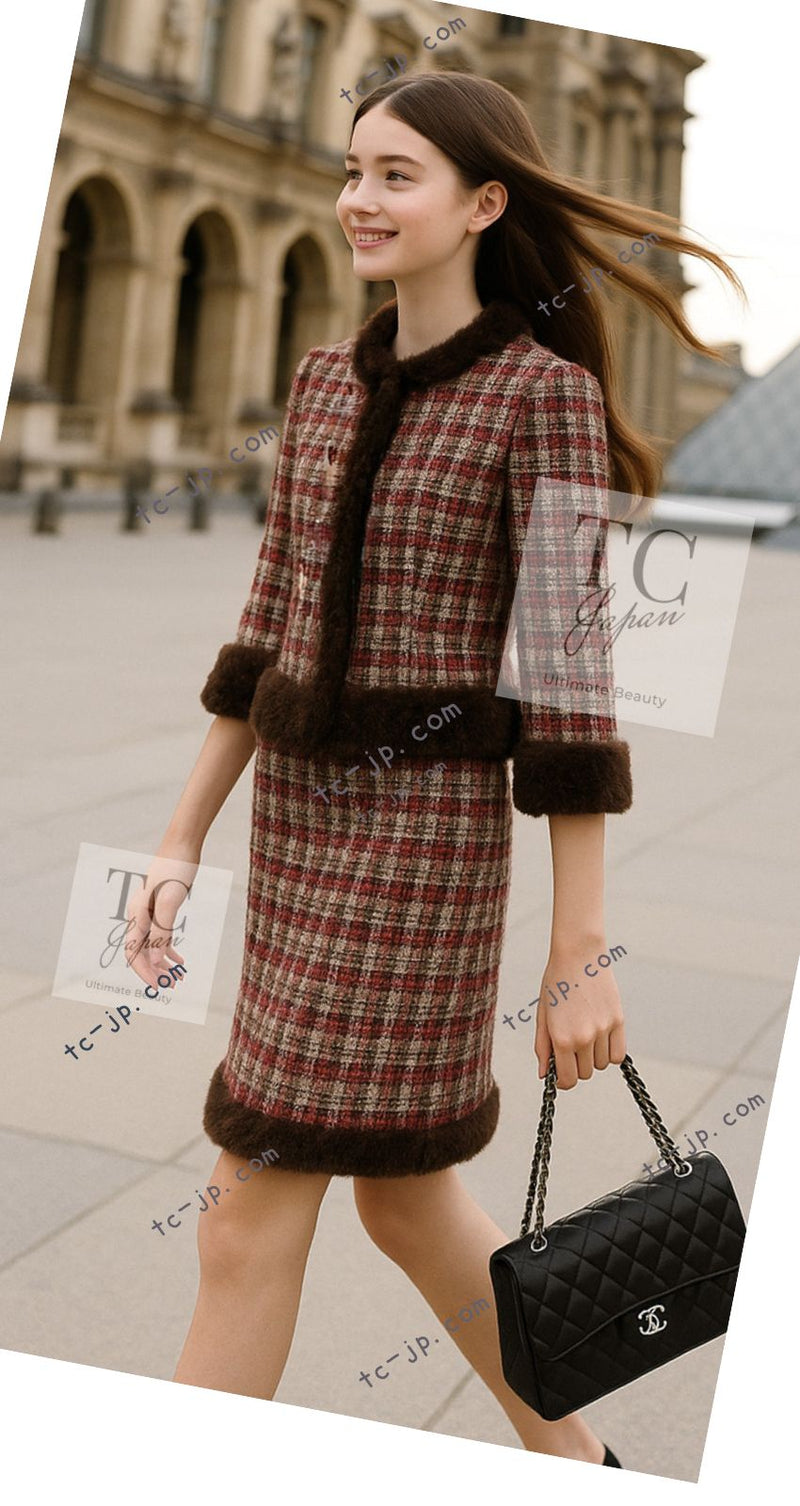 CHANEL 05A Rabbit Fur Trim Raspberry Brown Tweed Jacket Skirt Suit 38 シャネル ラビット・ファートリム・ラズベリー・ブラウン・ツイード・ジャケット・スカート・スーツ 即発