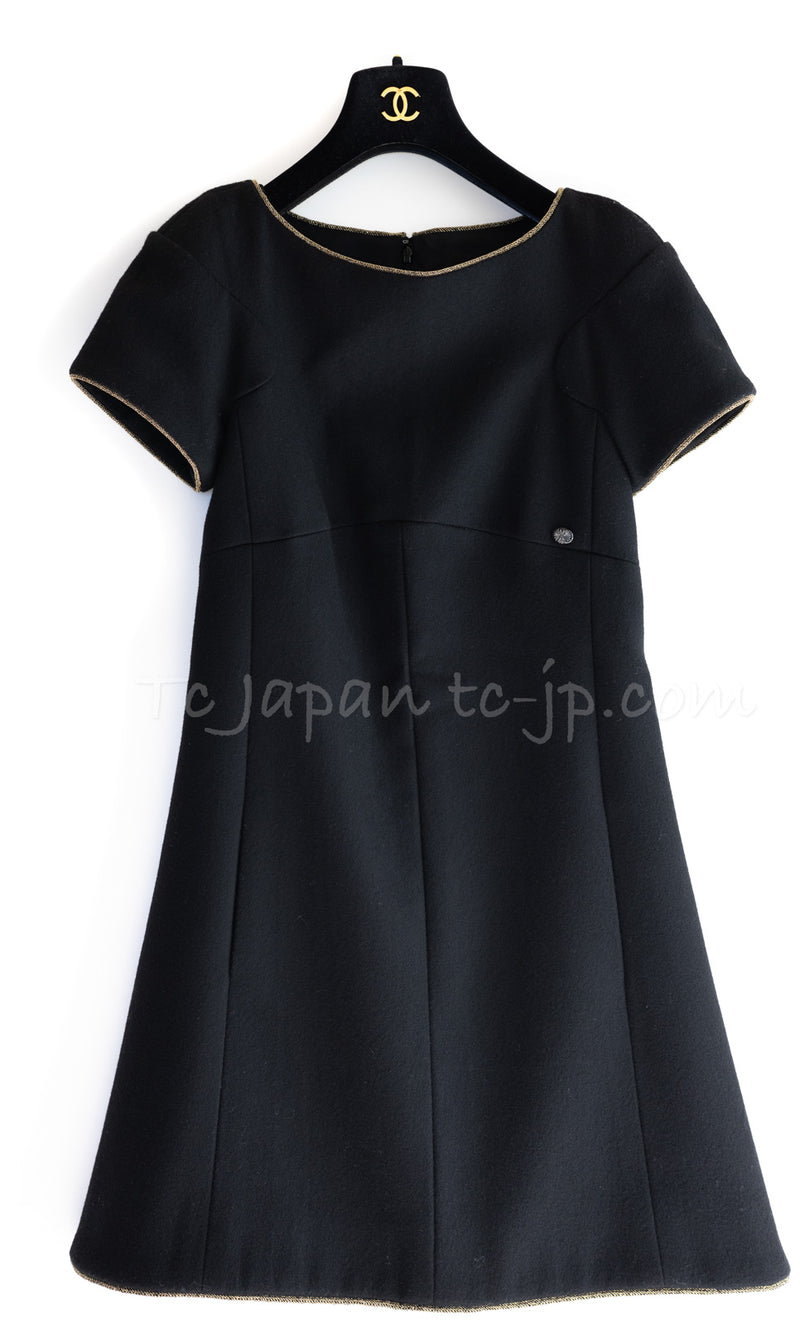 CHANEL 15PF Black Gold Trim Melton Wool 100 Dress 34 36 シャネル ブラック ゴールド トリム メルトン ウール ワンピース 即発