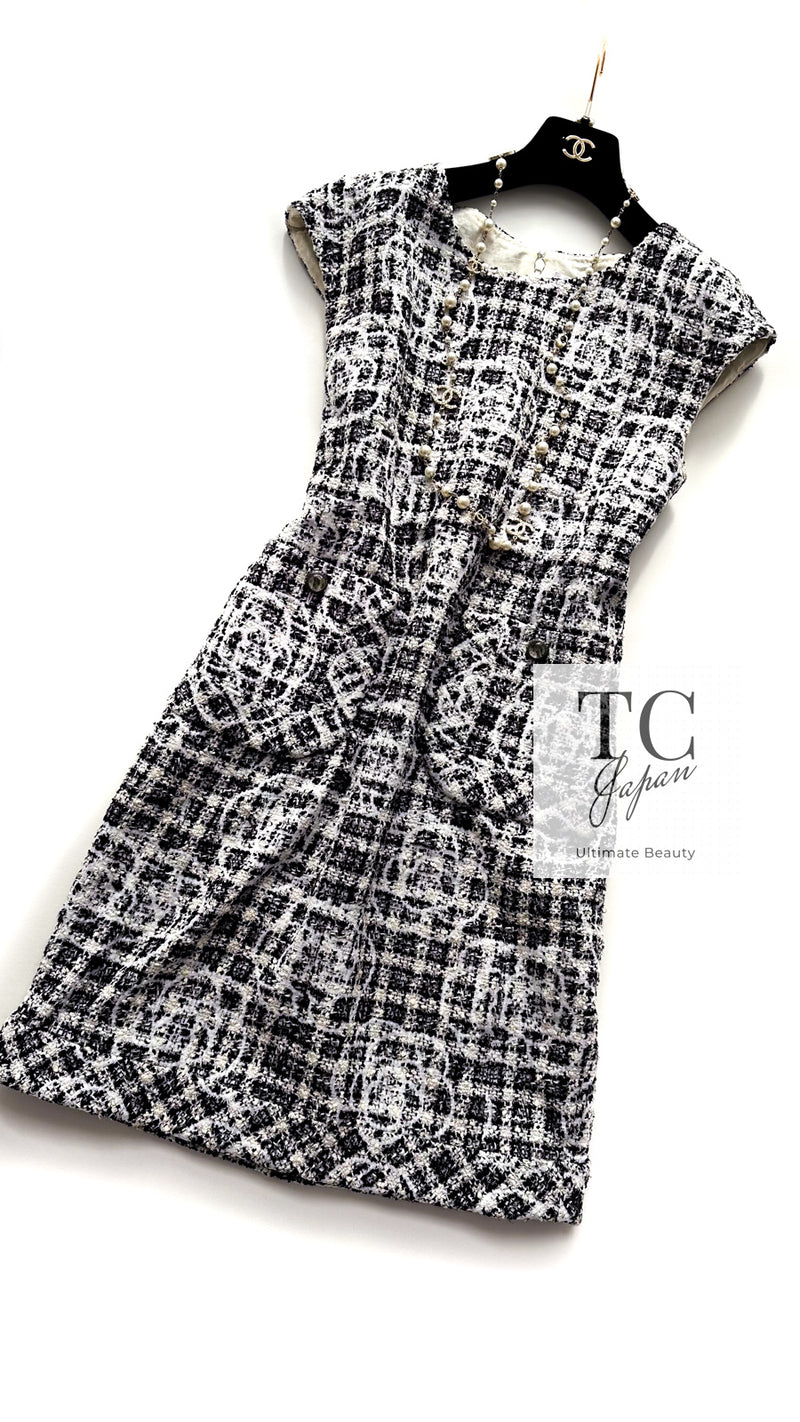 CHANEL 14S White Black Camellia Gripox Button Tweed Dress 34 シャネル ホワイト ブラック グレー カメリア グリポワ宝石ボタン ツイード ワンピース 即発