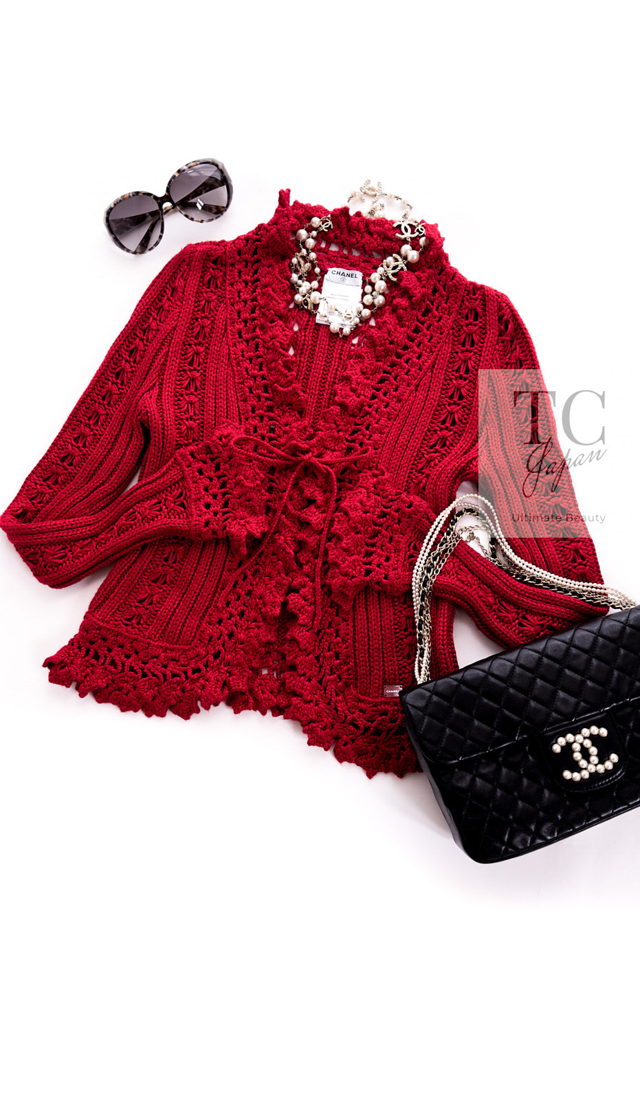 CHANEL 04S Red Crochet Frilled Knit Cardigan 34 シャネル レッド クロシェ フリル ニット カーディガン 即発