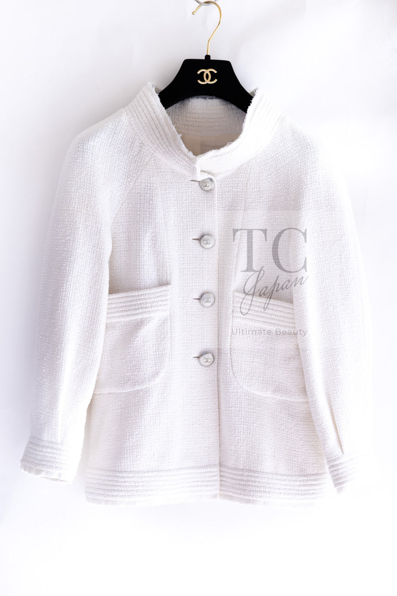 CHANEL 12S White Stand Collar Cotton Tweed Jacket 34 シャネル ホワイト コットン スタンド 襟 ツイード ジャケット 即発